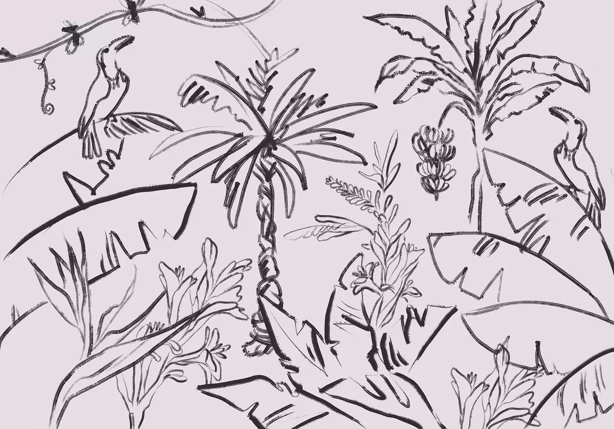 Тапете за зид Тропски узорак у црној боји, палме, банане, контурна графика бр. w04020v7