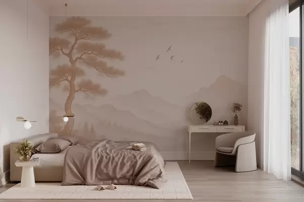 Тапете за зид панорама брда са великим дрветом у мока нијансама бр. w04033v1