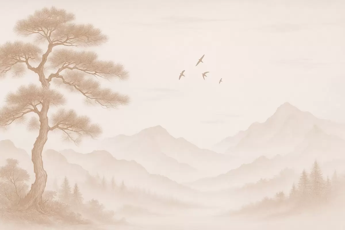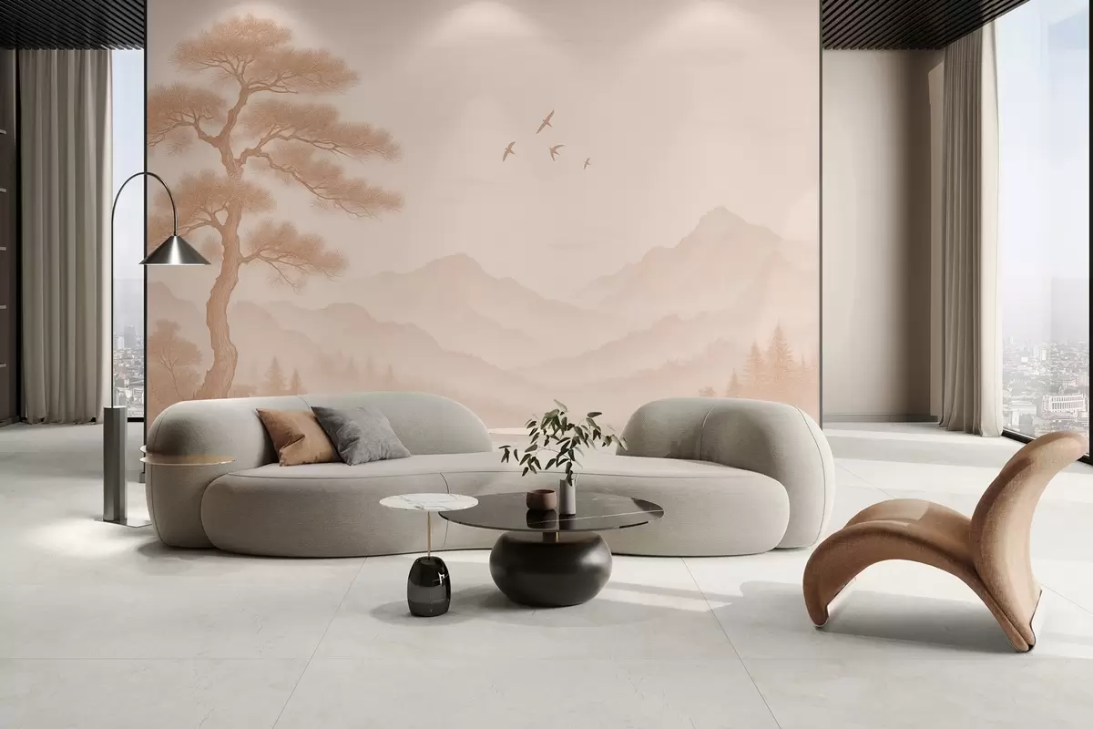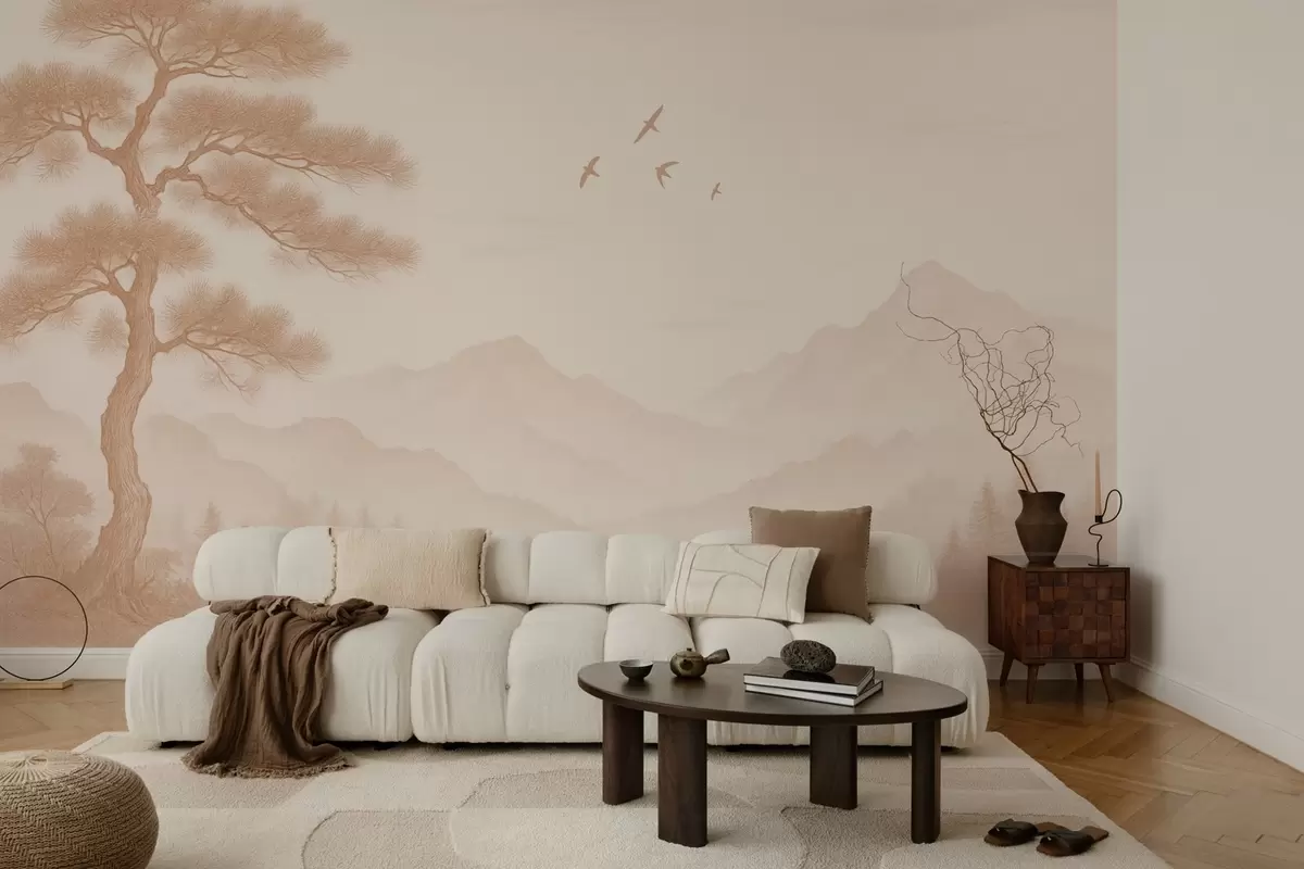 Тапете за зид панорама брда са великим дрветом у мока нијансама бр. w04033v1