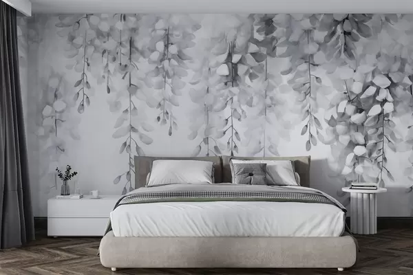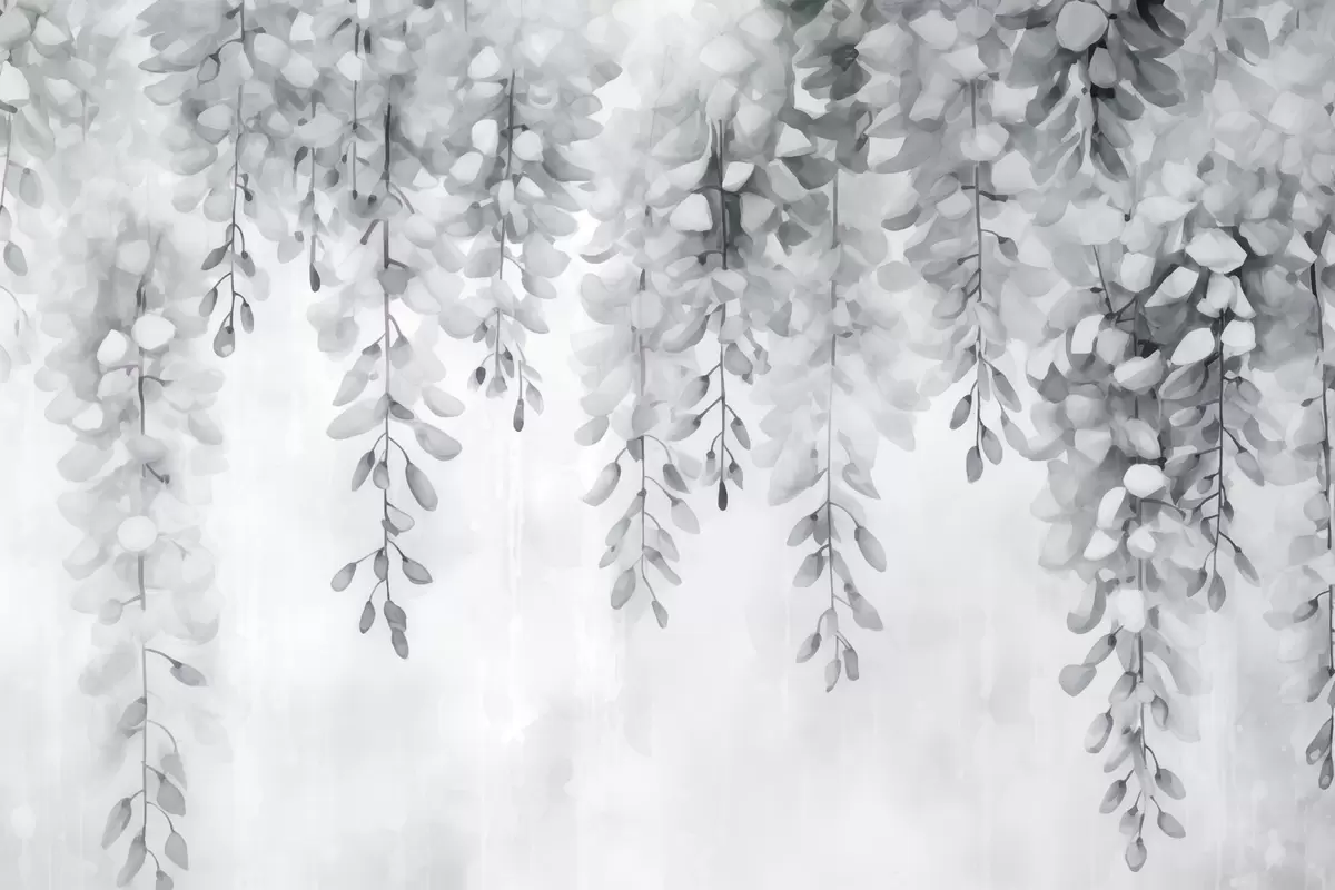 Тапете за зид Монохромни акварел са каскадним глицинијама у хладним сребрним и белим тоновима, који евоцира мир и зимску мекоћу бр. w04034v1