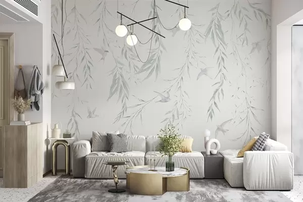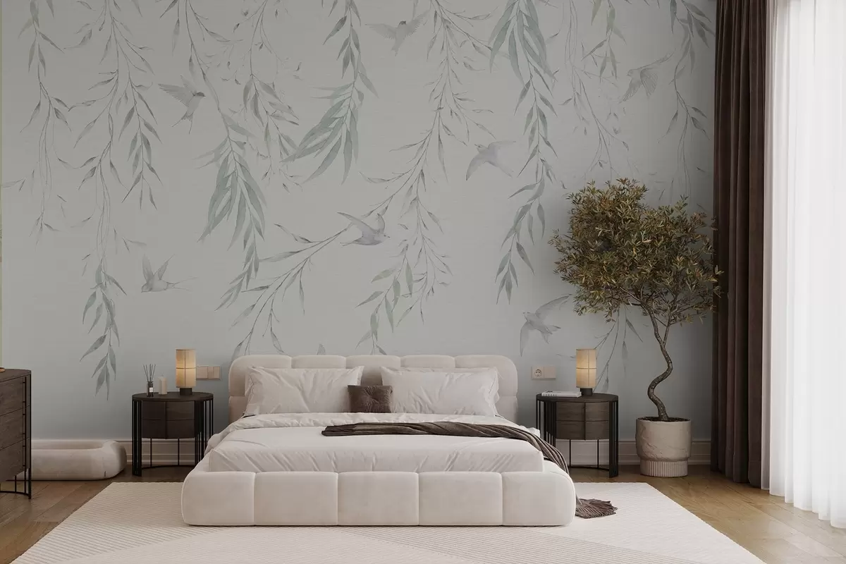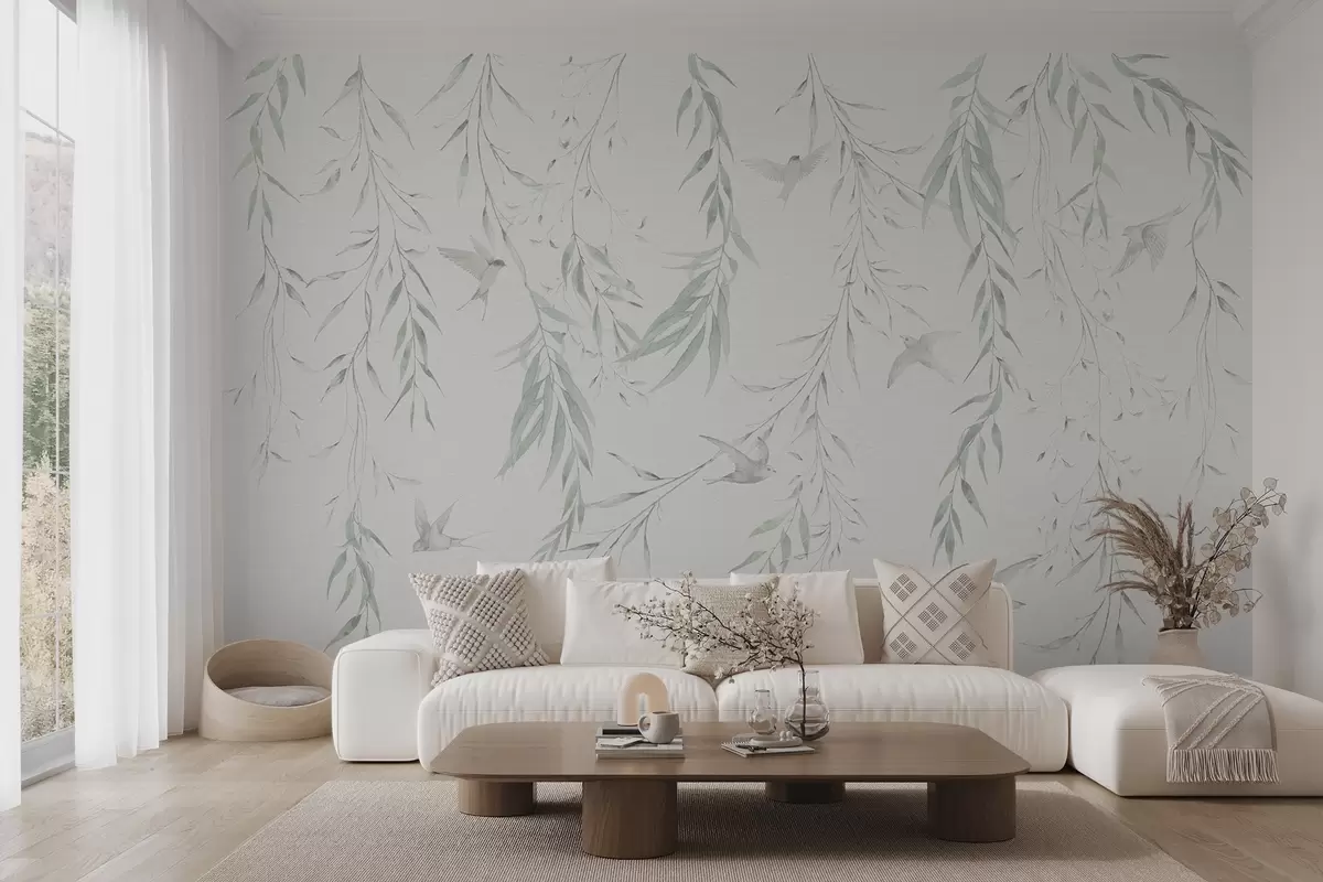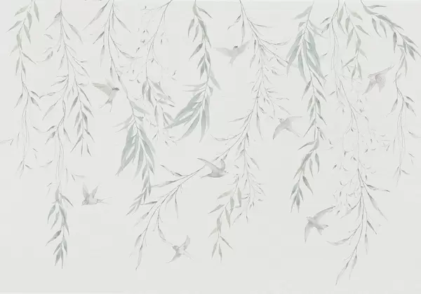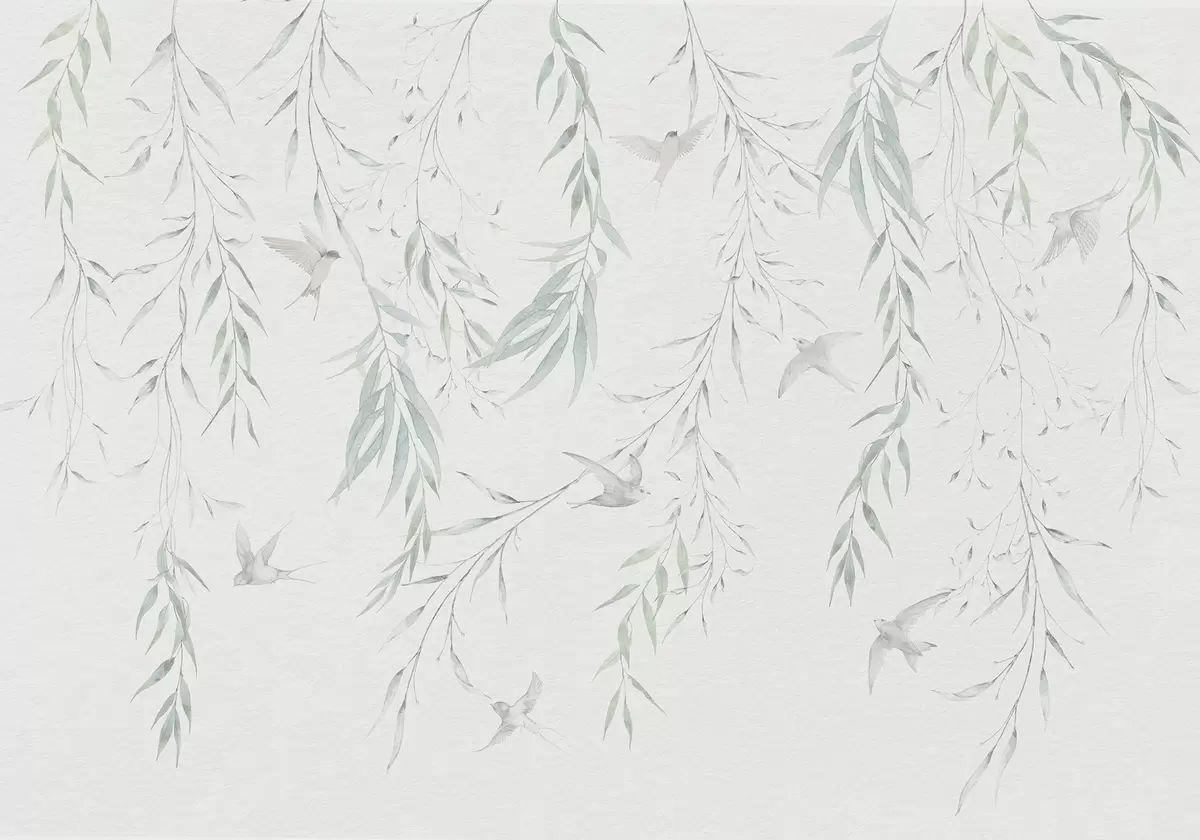 Тапете за зид Гранчице са зеленим листовима које висе и птице бр. w04052