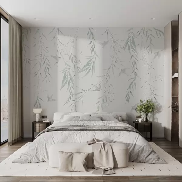 Тапете за зид Гранчице са зеленим листовима које висе и птице бр. w04052