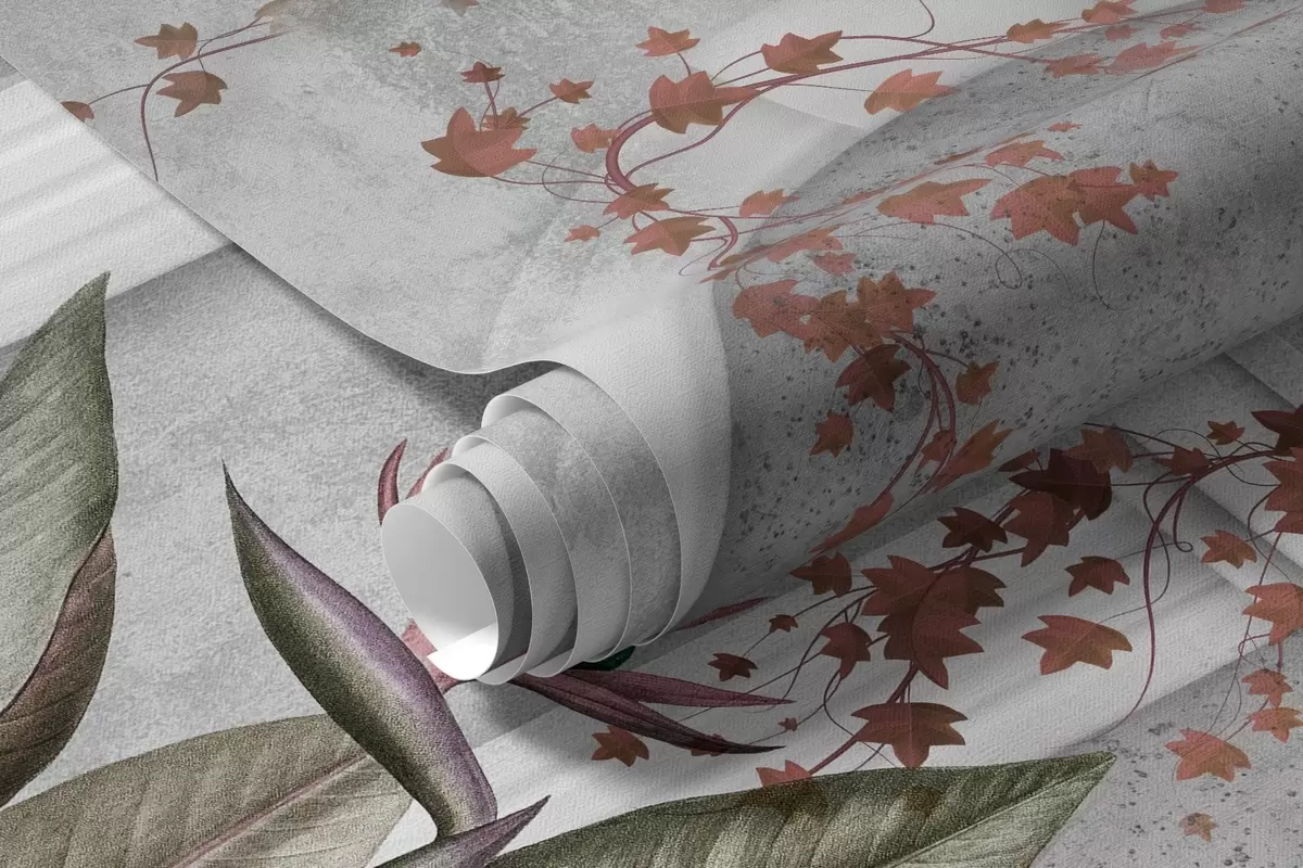 Тапете за зид Бетонски зид са луковима и тропским биљкама, цветним, бордо бојама бр. w04065v1