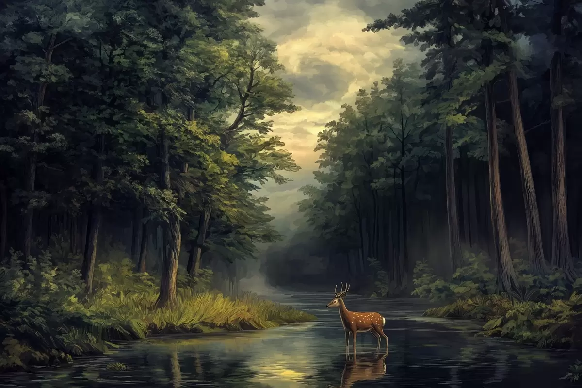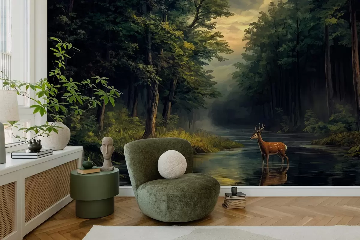 wall murals Шума са јеленима и реком у стилу холандског уљаног сликарства w04072