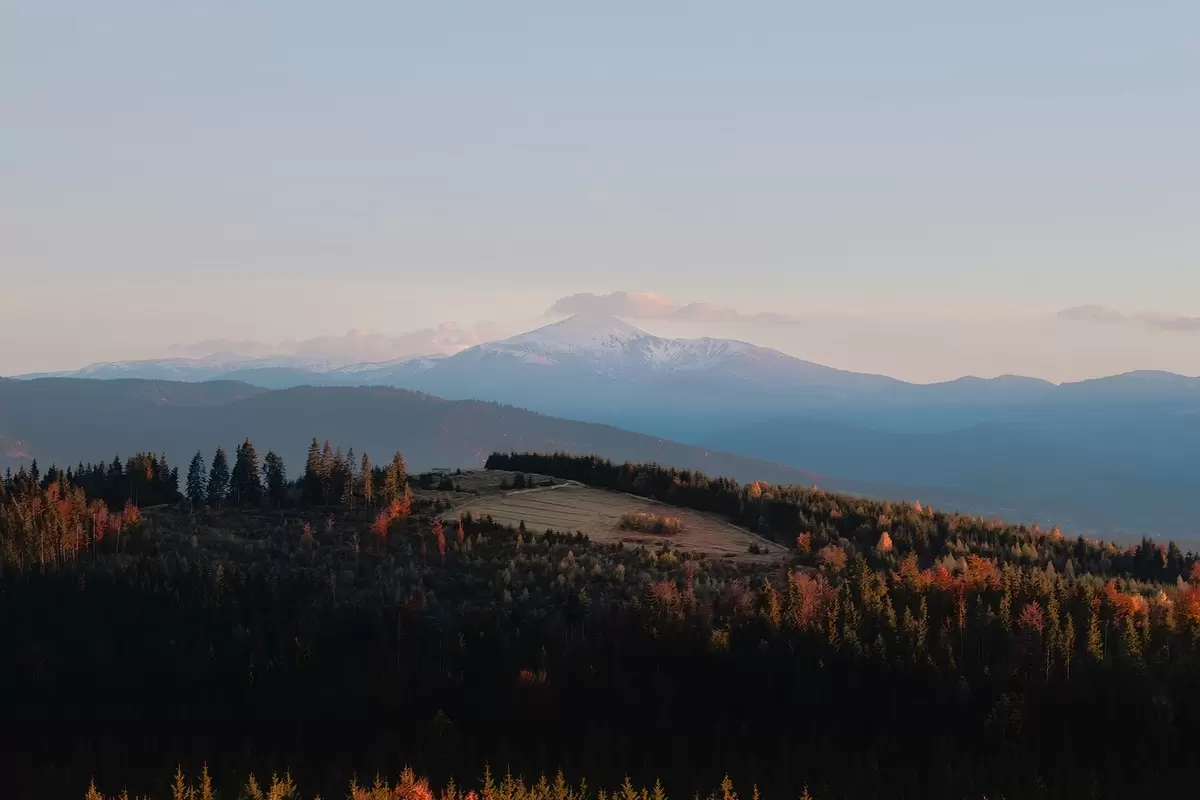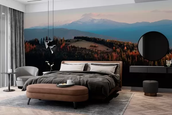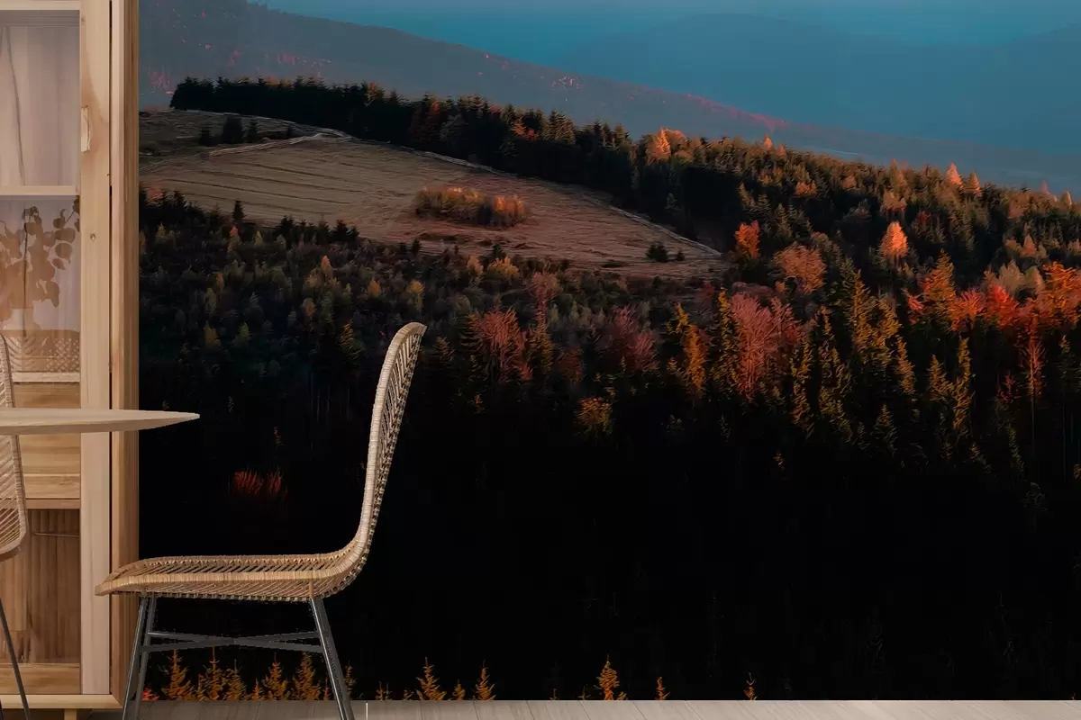 Тапете за зид Карпати, текстура уљаног стила, јесења шума, небо са заласком сунца бр. w04098