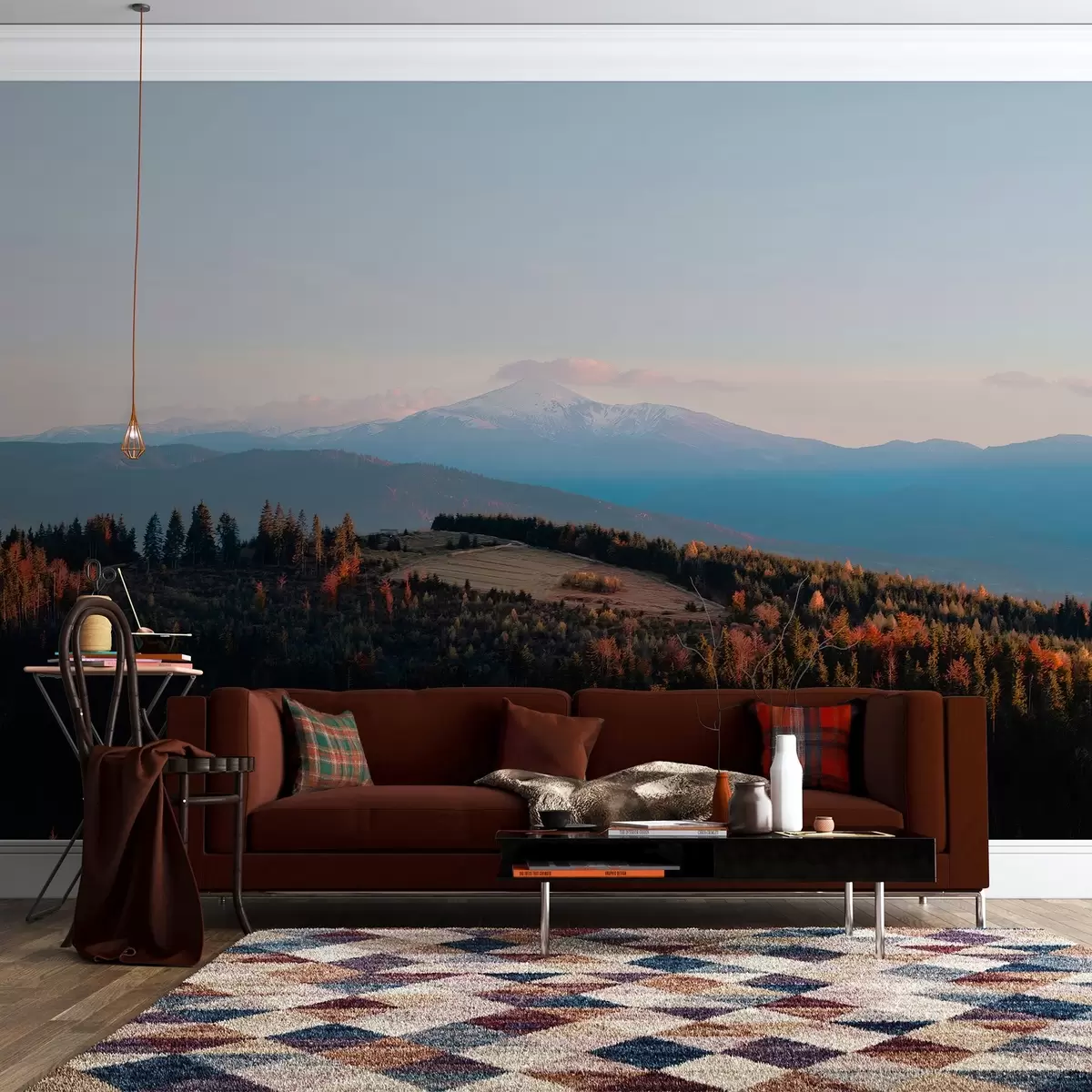Тапете за зид Карпати, текстура уљаног стила, јесења шума, небо са заласком сунца бр. w04098