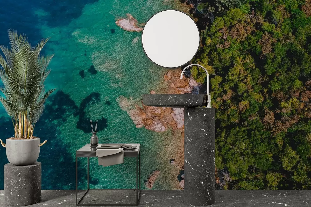 Тапете за зид Шпанска морска обала са аквамаринском водом, боровом шумом, аерофотографијом бр. w04099