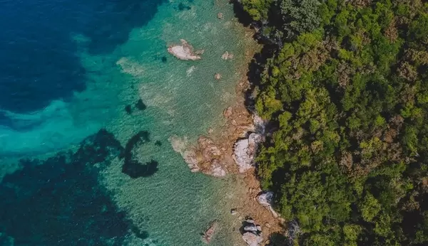 Тапете за зид Шпанска морска обала са аквамаринском водом, боровом шумом, аерофотографијом бр. w04099