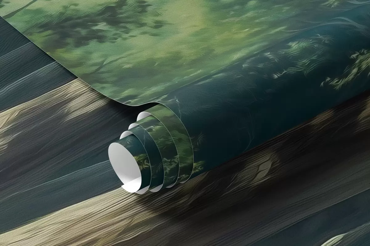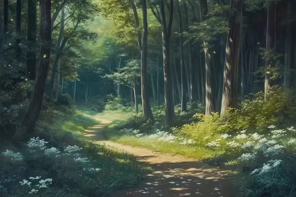 Тапете за зид Зелена шума са нежном сунчевом светлошћу, дрвећем и белим цвећем, цртеж уљаним стилом бр. w04118