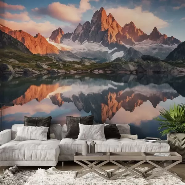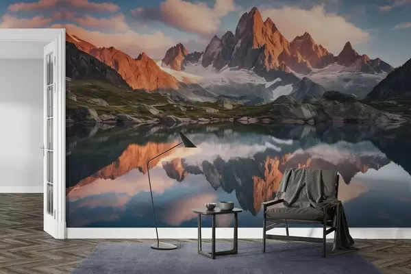 Тапете за зид Планине у зору, одраз у води, реалистичан пејзаж бр. w04150