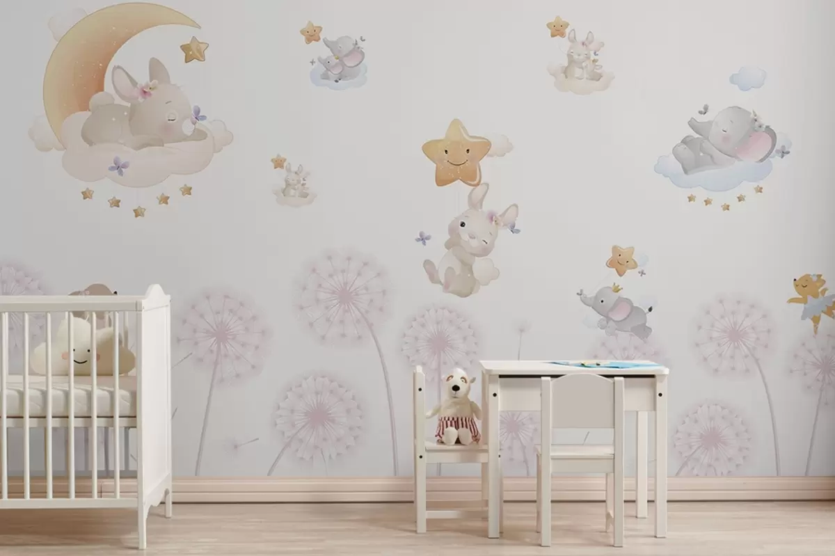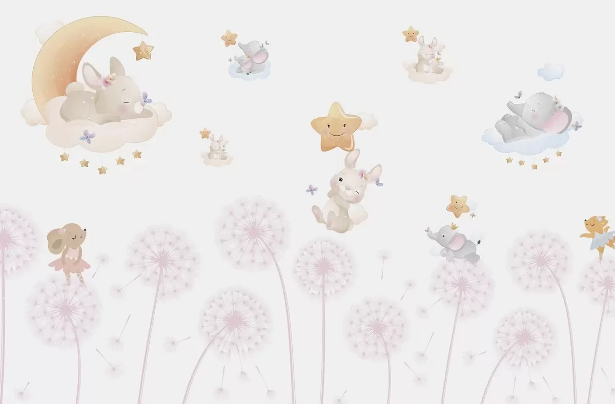Тапете за зид Слатки зец и звезде међу маслачком на белој позадини бр. w04195