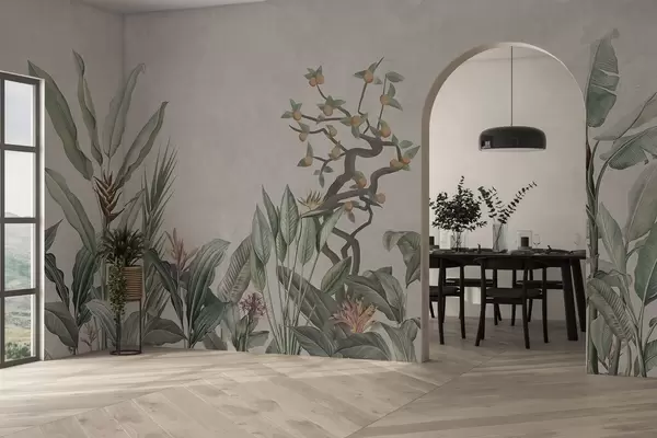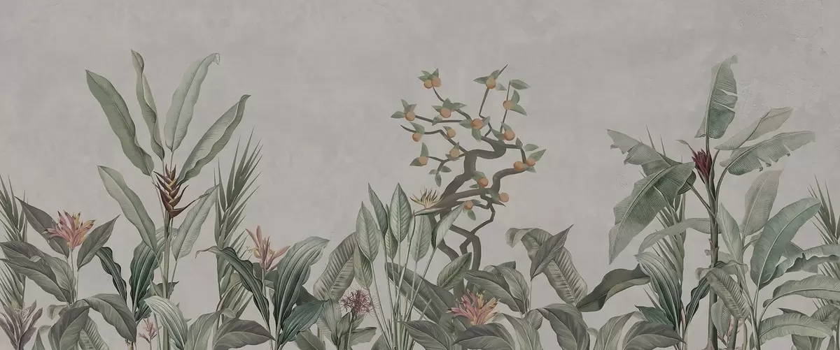 wall murals Тропска композиција са биљкама и дрвећем на сивкастој позадини w04201v1