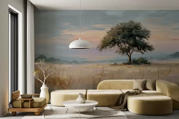 Тапете за зид дрво усред поља у стилу уљаног сликарства бр. w04206