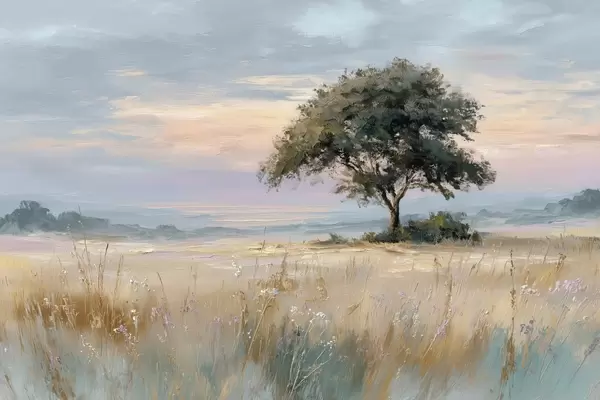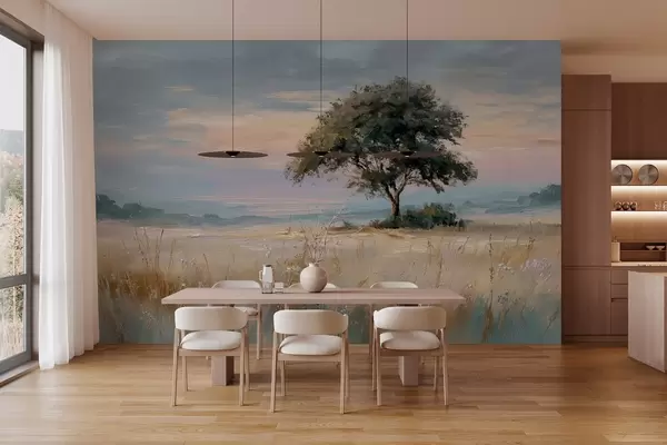 Тапете за зид дрво усред поља у стилу уљаног сликарства бр. w04206