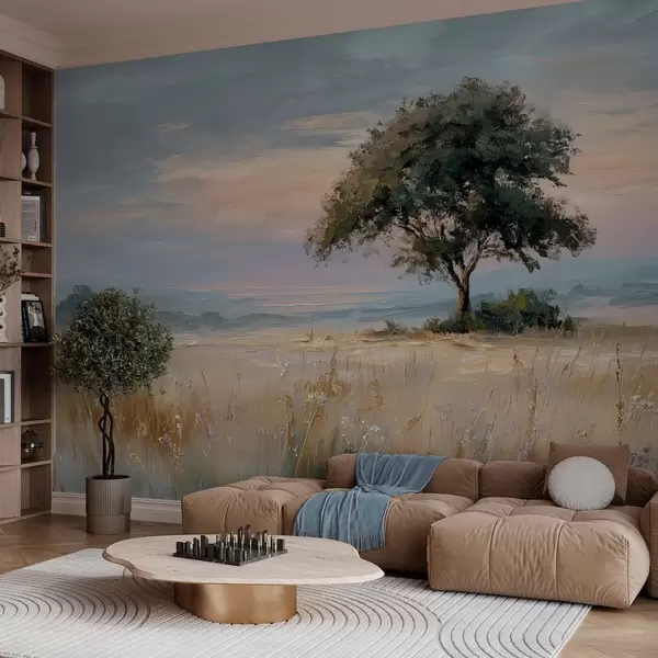 Тапете за зид дрво усред поља у стилу уљаног сликарства бр. w04206