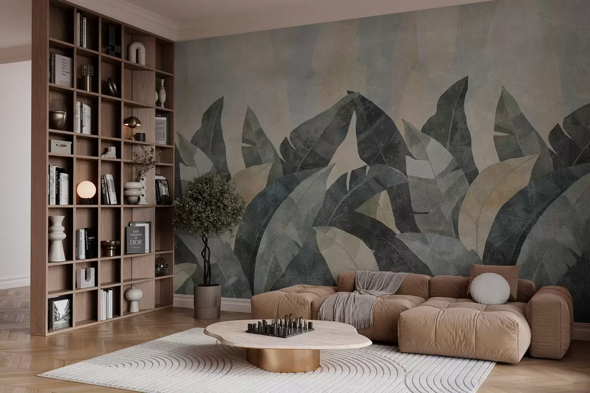 Тапете за зид текстурирани листови банане у природним нијансама беж, зелене и сиве бр. w04285