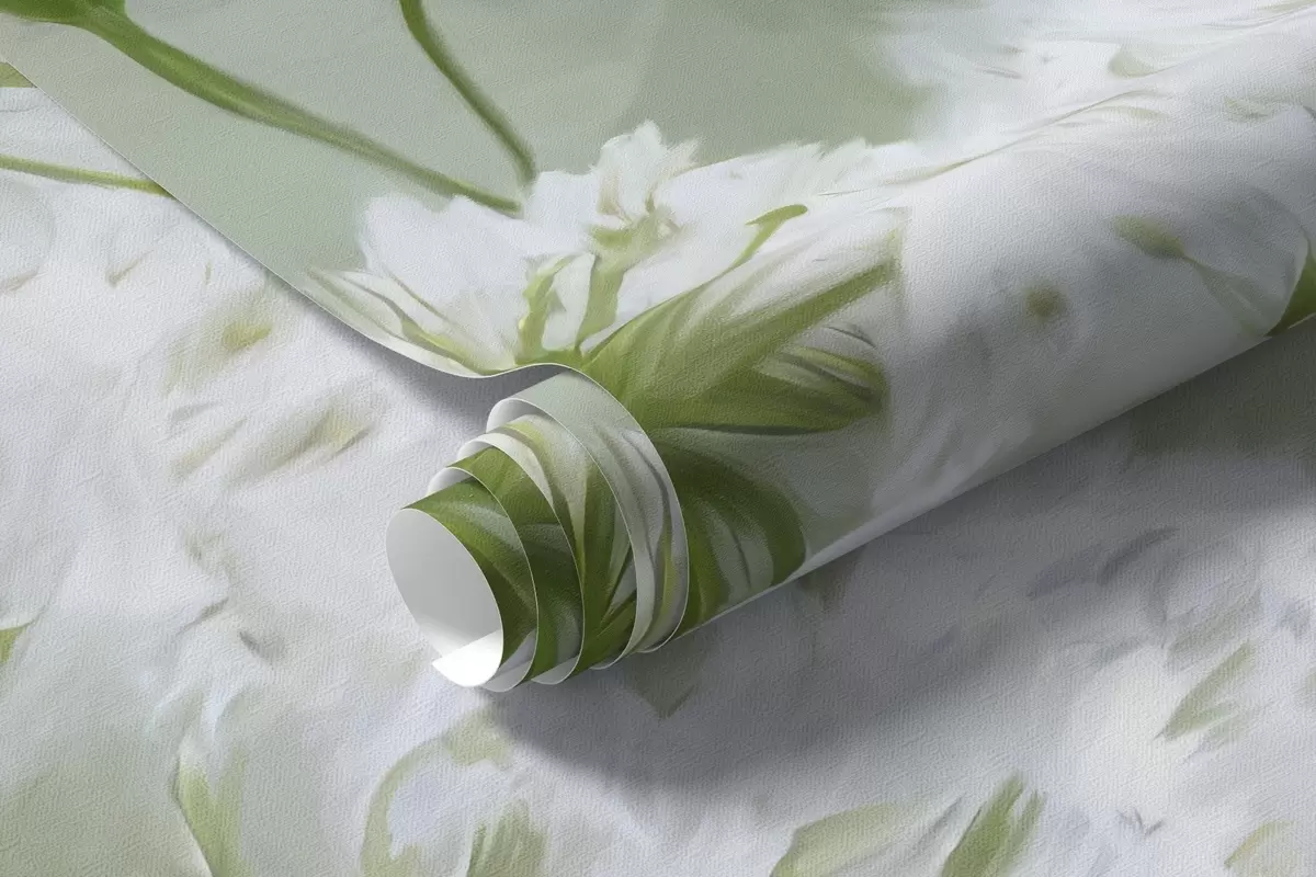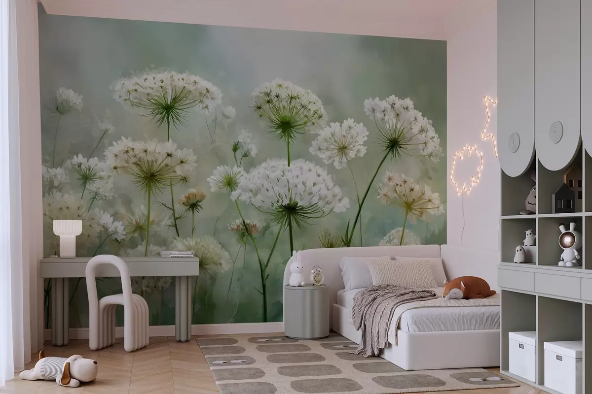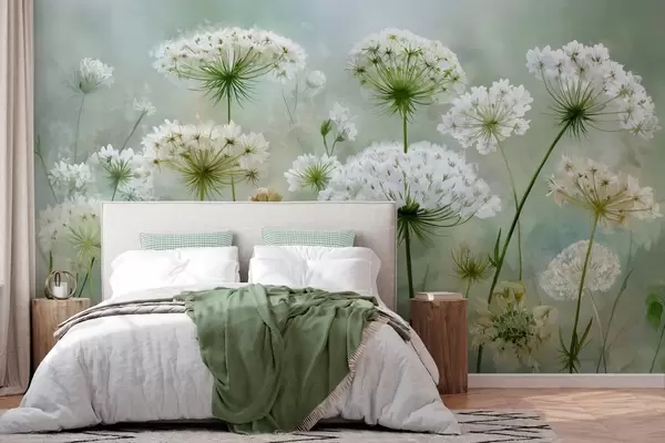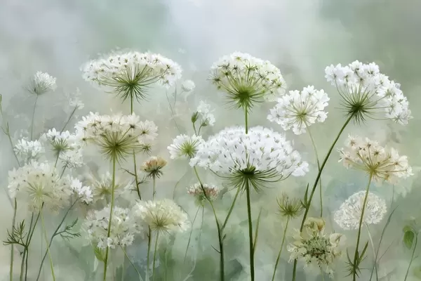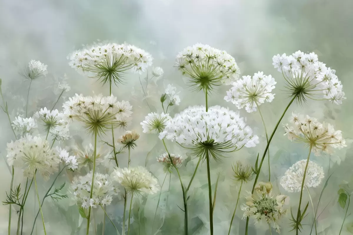 Тапете за зид Нежно бело дивље цвеће краљице Ане, у сликовитом стилу, зелени тонови бр. w04313