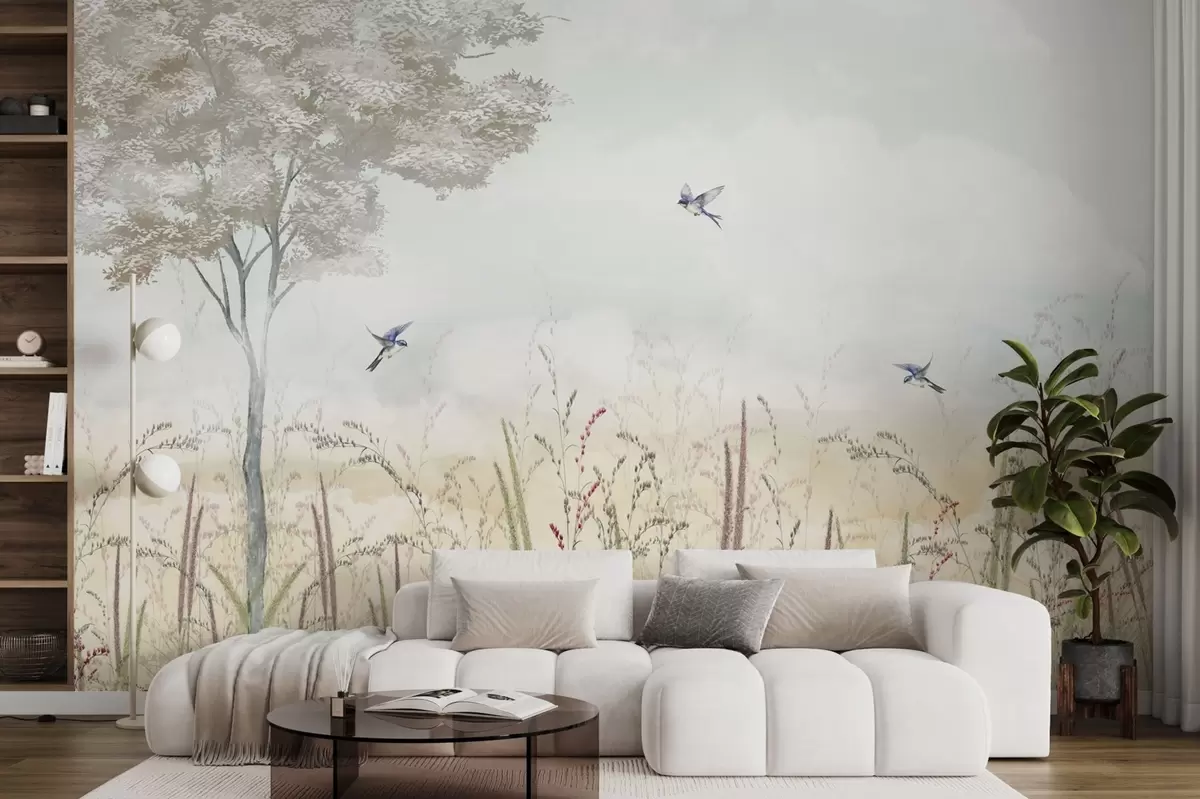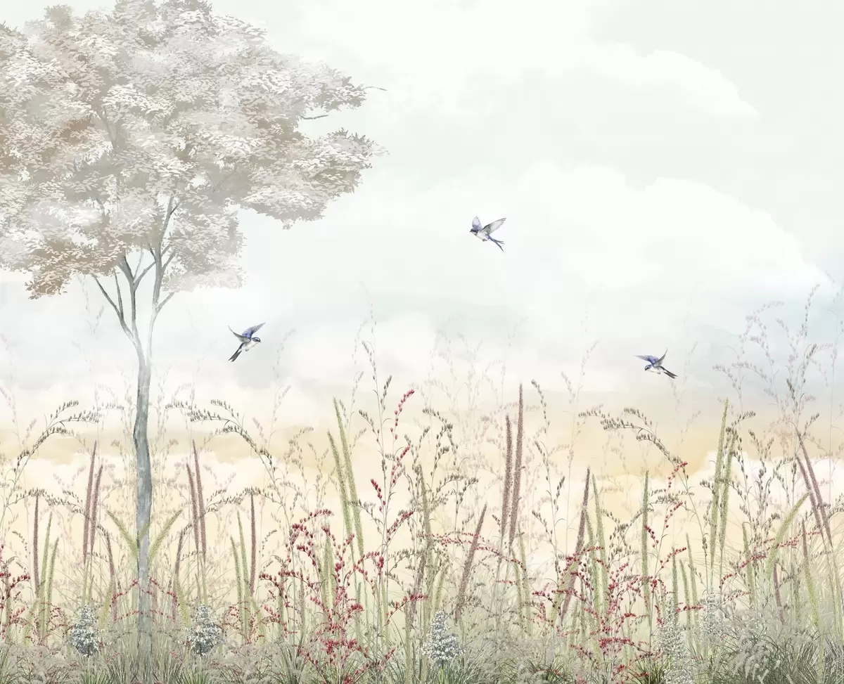 Тапете за зид Пејзаж са дрвећем, птицама и ливадским травама бр. w04350