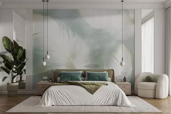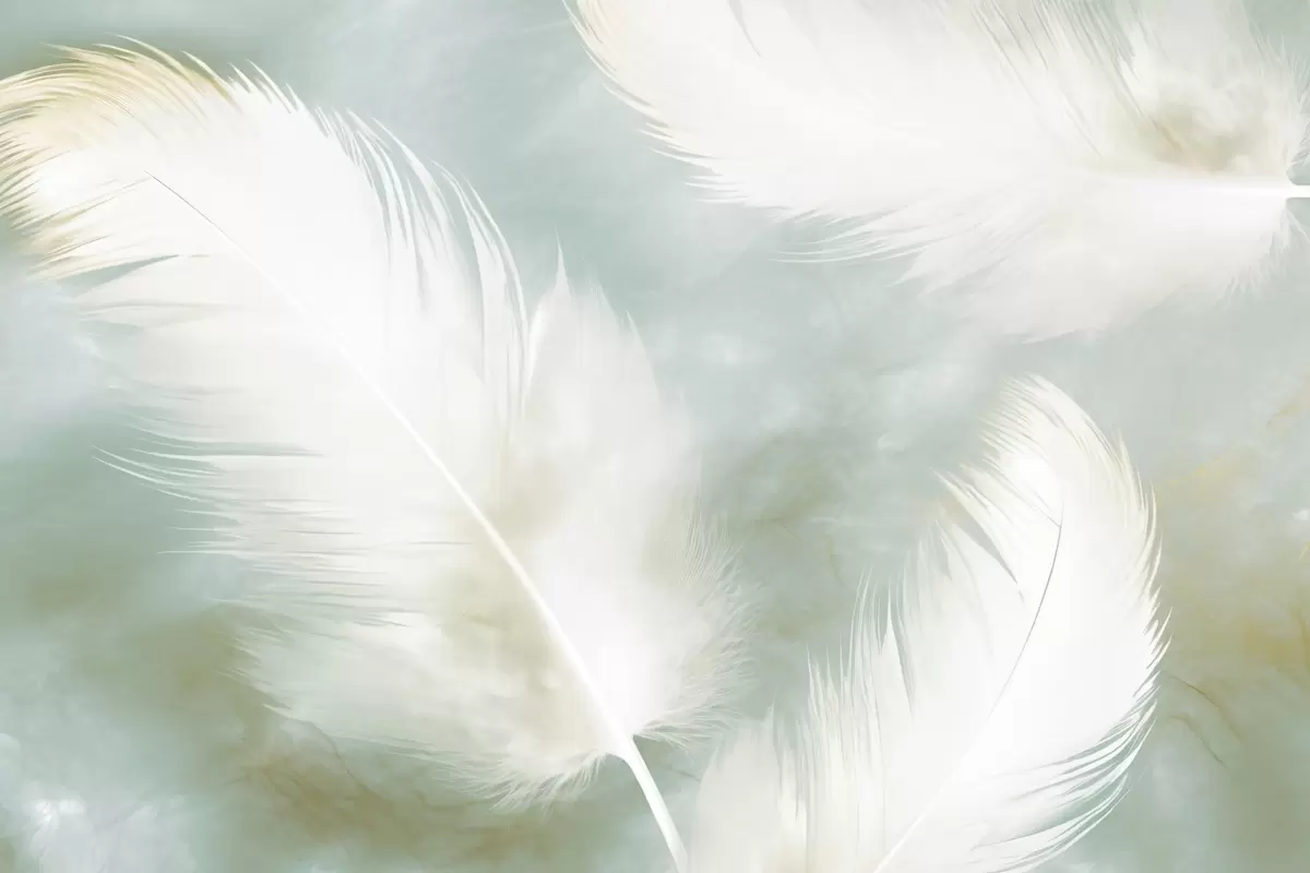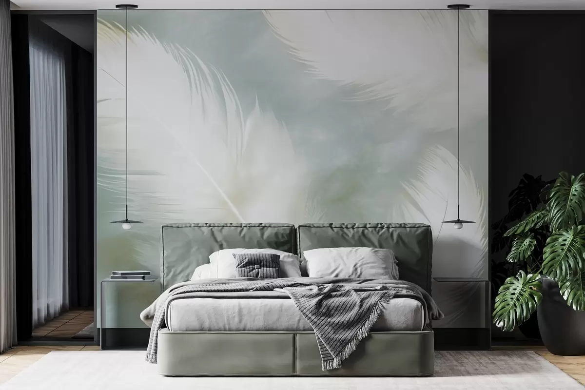 Тапете за зид Нежно бело перје на мекој позадини боје менте бр. w04399