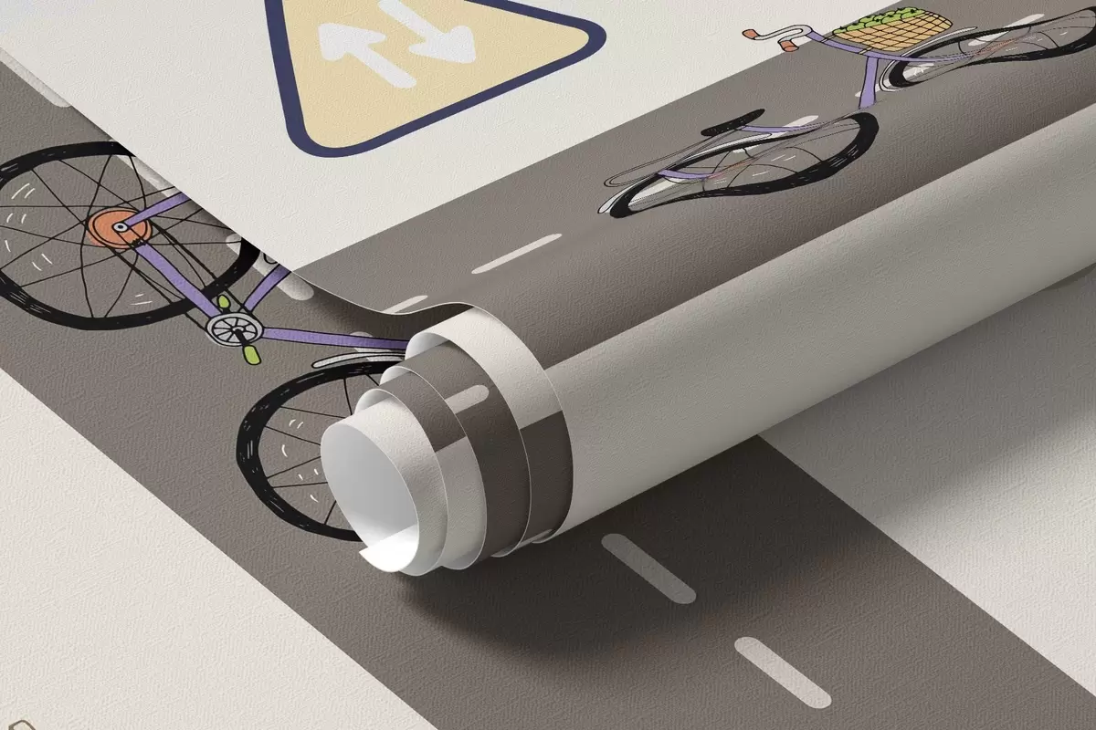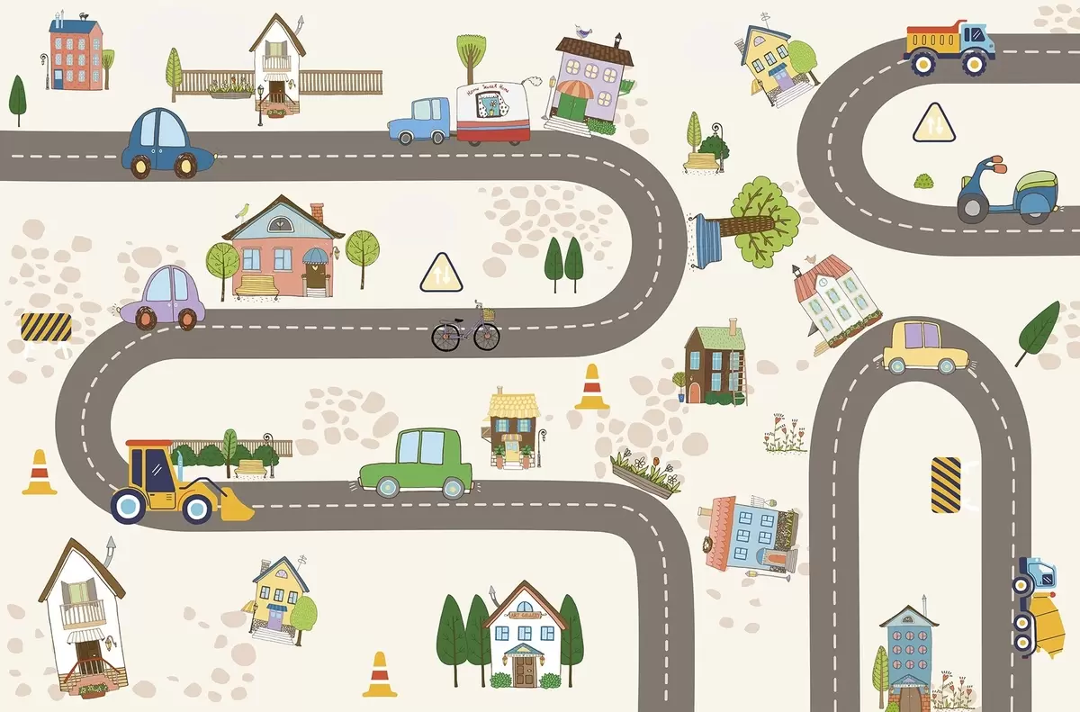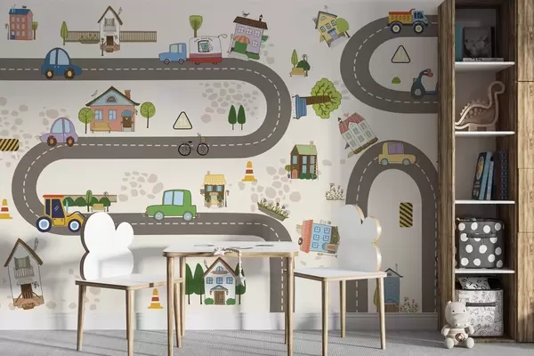 Тапете за зид Дечји пут са аутомобилима и шареним кућама бр. w04404