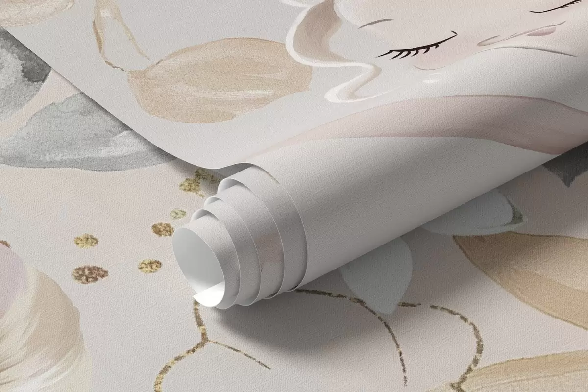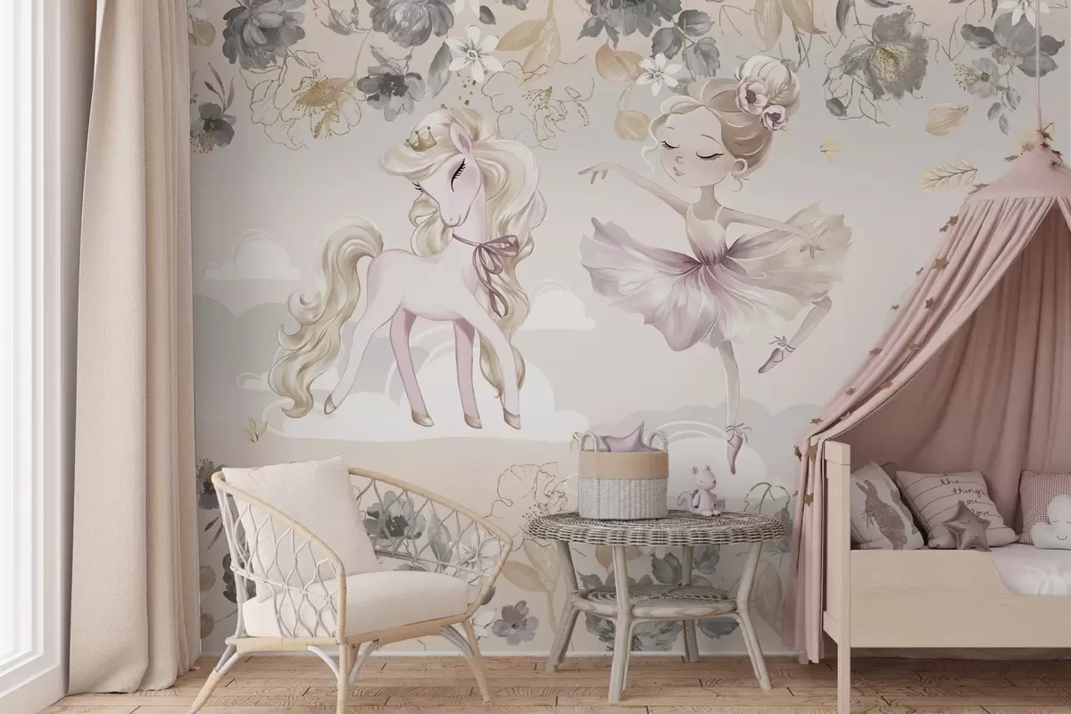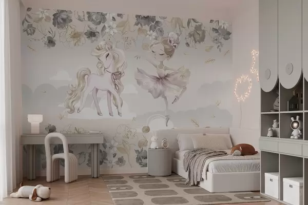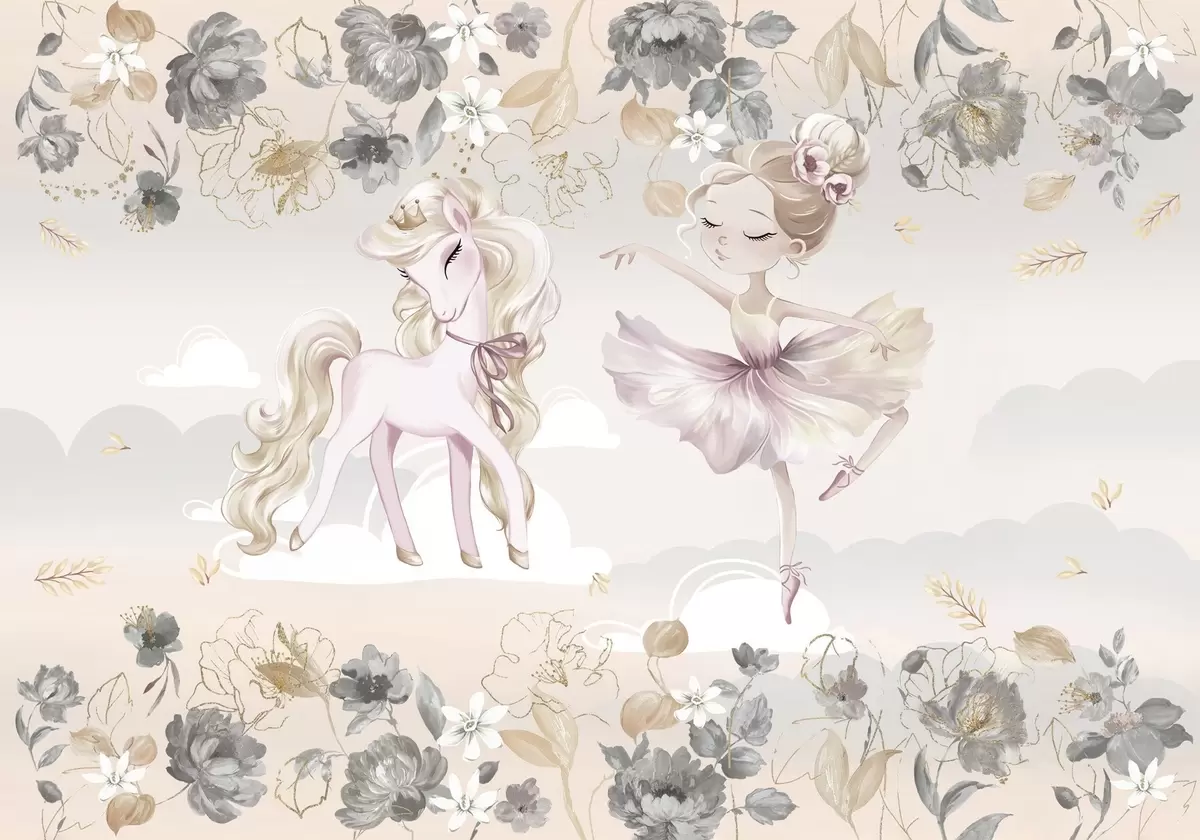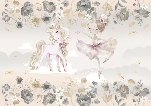 Тапете за зид Снежнобели пони и балерина међу цвећем и облацима бр. w04419