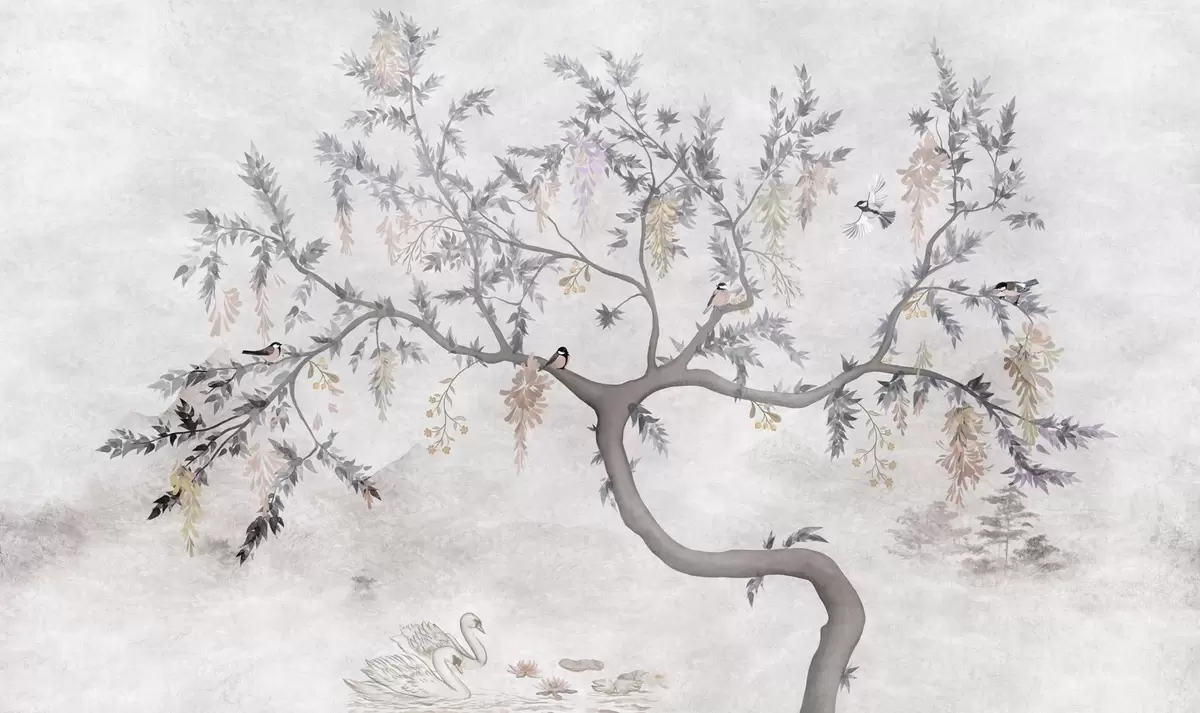 Тапете за зид Грана дрвета са птицама у оријенталном стилу бр. w04456
