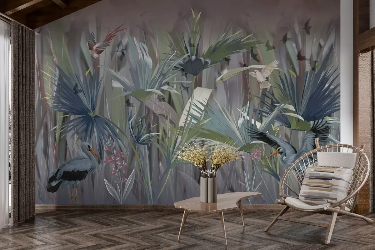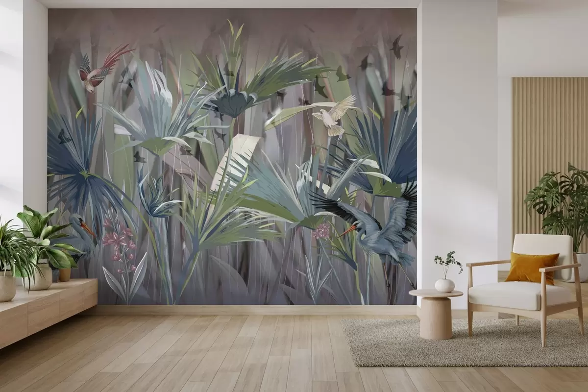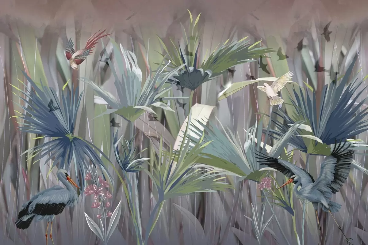 Тапете за зид Егзотичне птице међу палминим листовима и цвећем бр. w04458