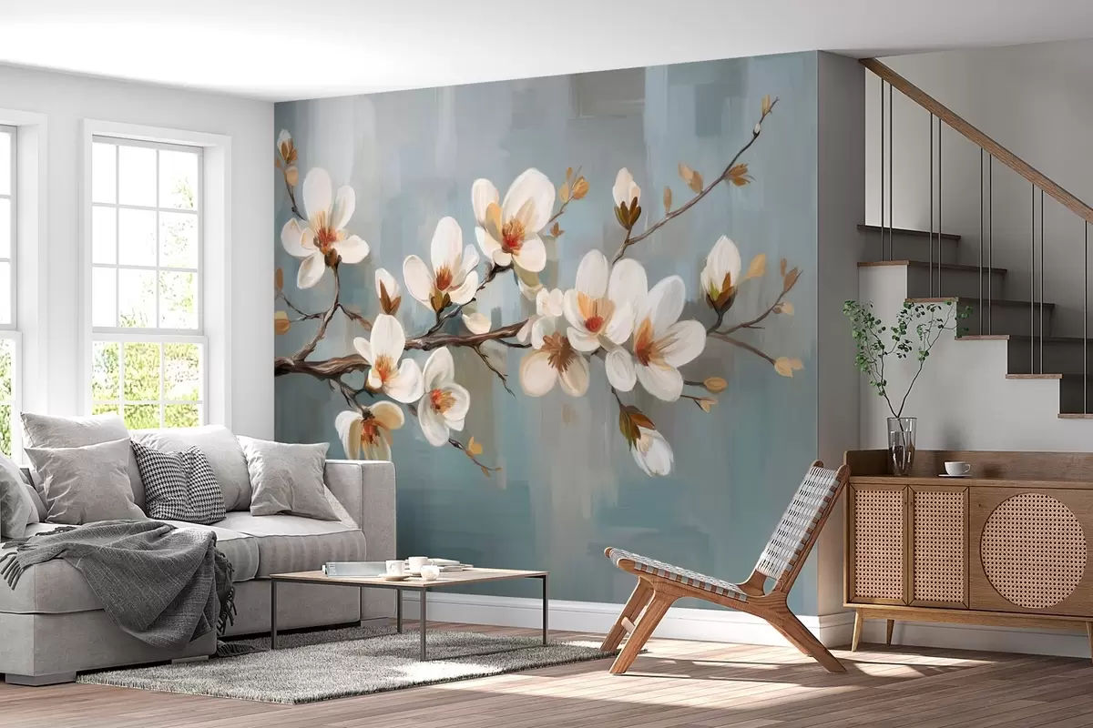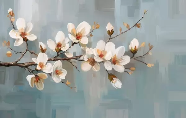 Тапете за зид Цветајућа грана у стилу уљаног сликарства на плавој позадини бр. w04496
