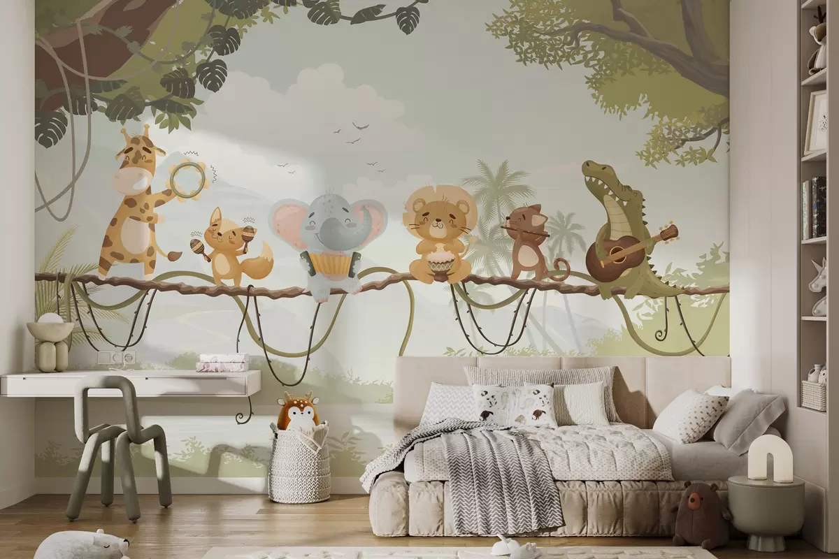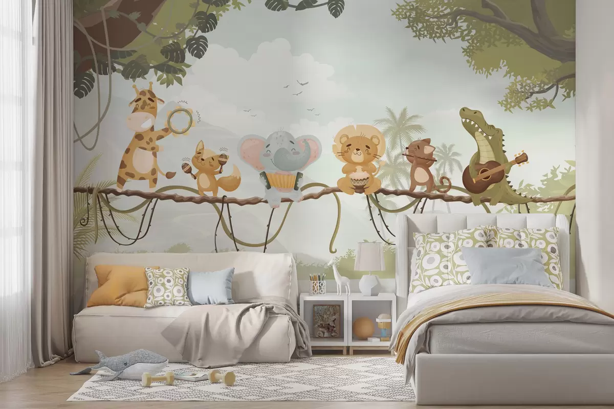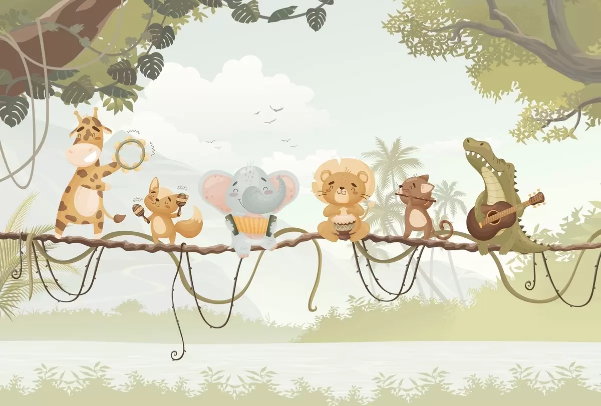 Тапете за зид Животиње са музичким инструментима насупрот тропског пејзажа бр. w04505v1