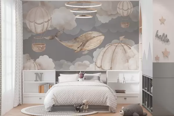 Тапете за зид Кит и балони на врући ваздух међу меким облацима бр. w04522
