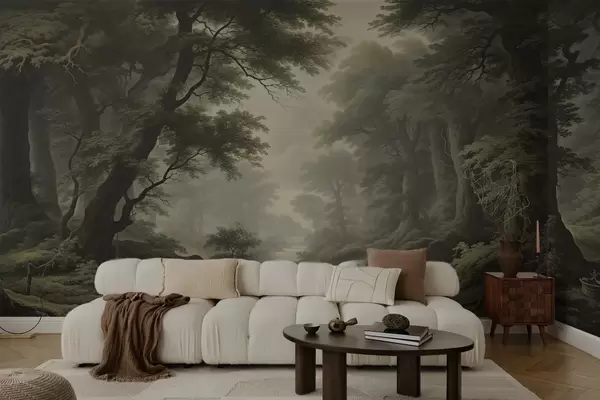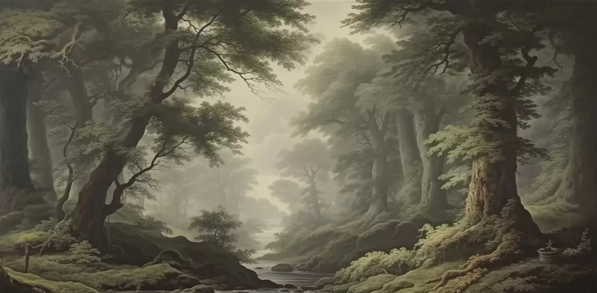Тапете за зид Магловита шума са реком и високим древним дрвећем бр. w04555