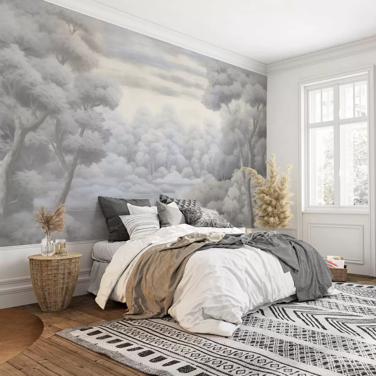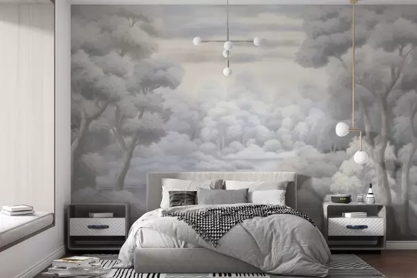Тапете за зид Магловита шума и језеро у меким сивим тоновима бр. w04617