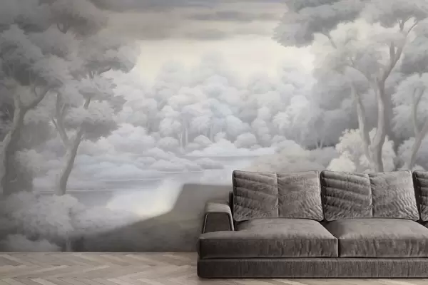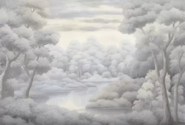 Тапете за зид Магловита шума и језеро у меким сивим тоновима бр. w04617