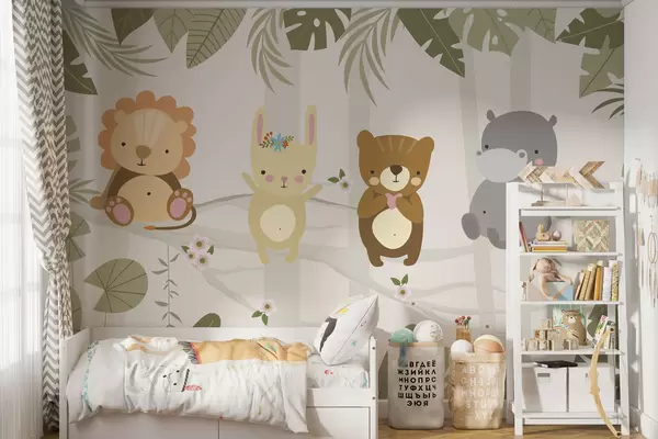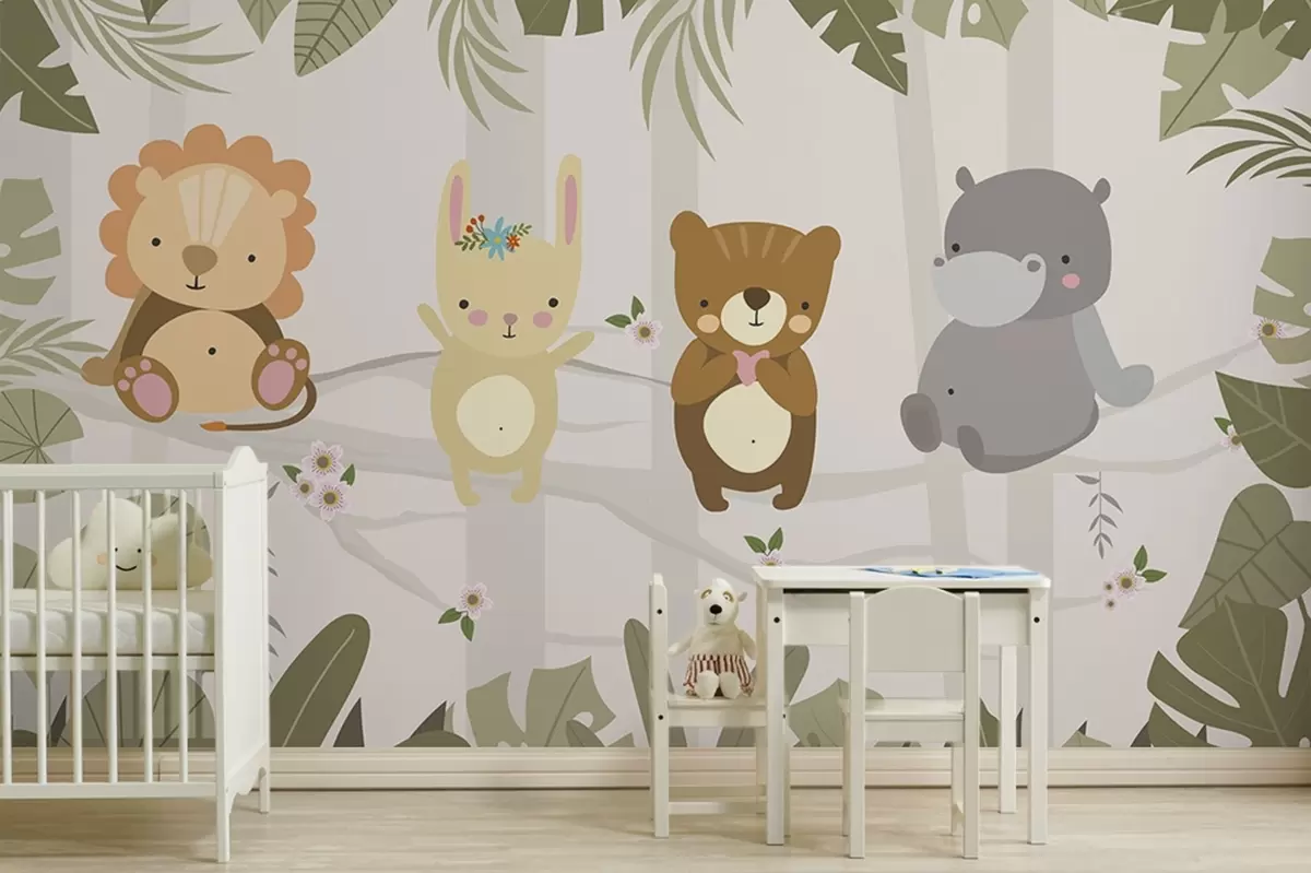 Тапете за зид Слатки лав, зека, медвед и нилски коњ међу лишћем бр. w04682