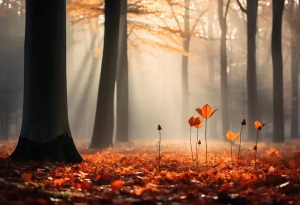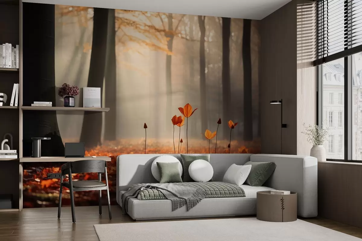 Тапете за зид Јесења шума са сунчевим зрацима и светлим лишћем бр. w04710