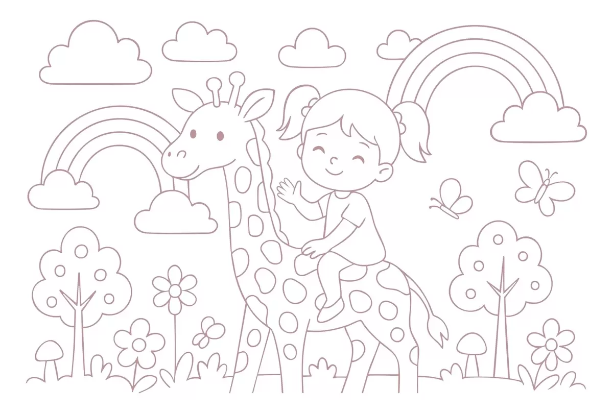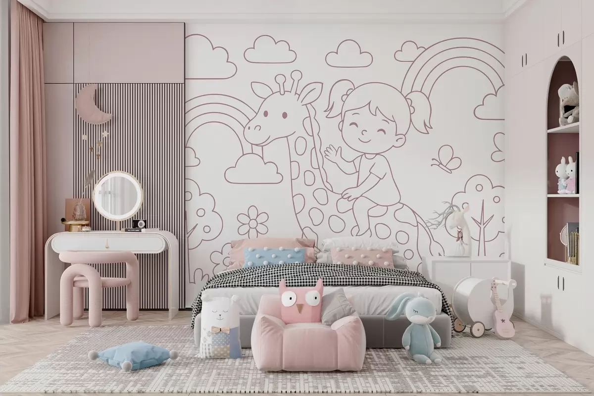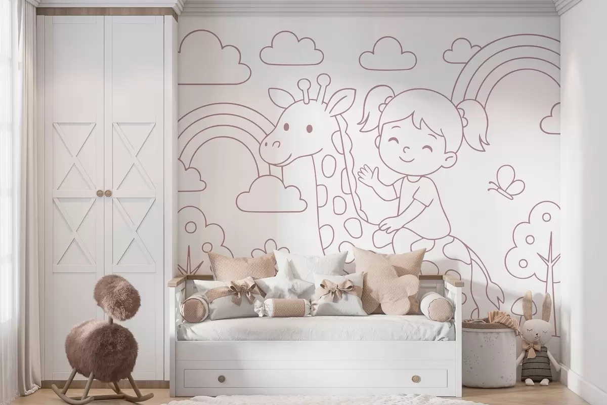 Тапете за зид прашкасто фарбање девојчице на жирафи у стилу дечје бојанке бр. w04753v1