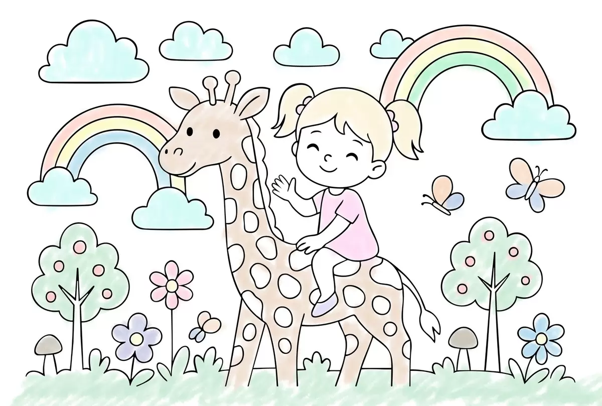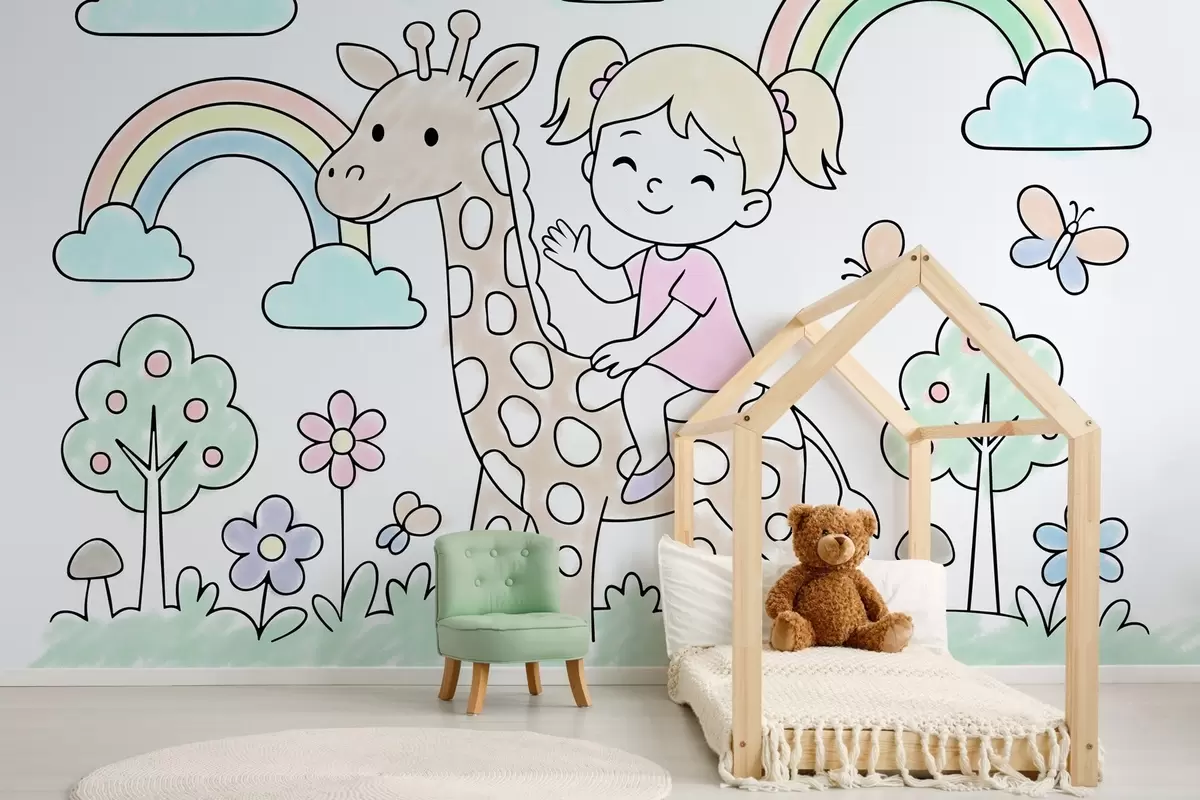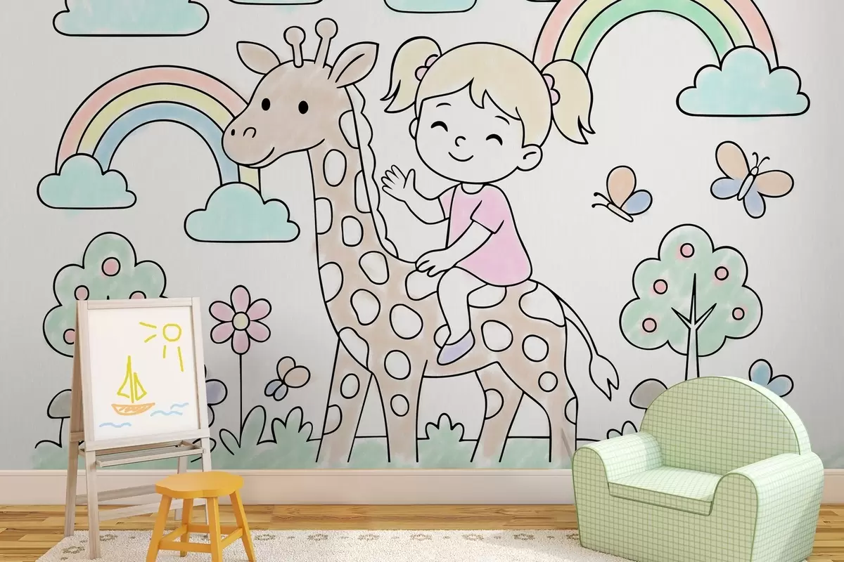 Тапете за зид Девојчица на жирафи у стилу дечје бојанке бр. w04755