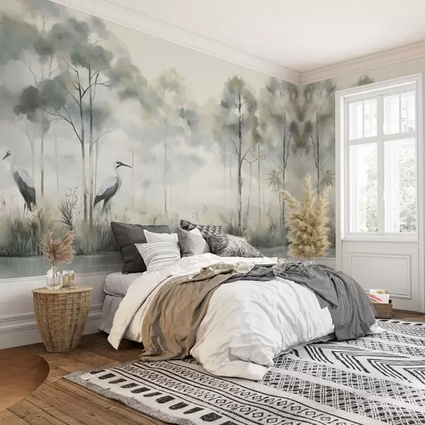 Тапете за зид Магловита шума поред воде са чапљама, мека хладна палета бр. w04788