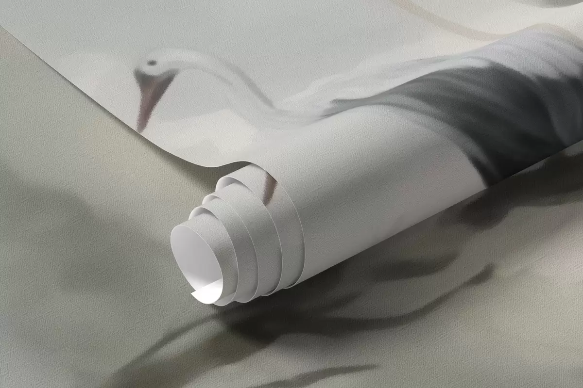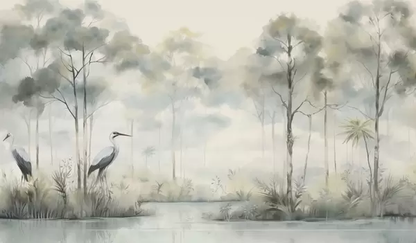 Тапете за зид Магловита шума поред воде са чапљама, мека хладна палета бр. w04788
