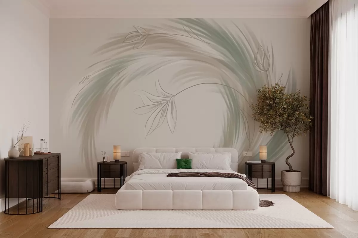 Тапете за зид зелено и беж перје и цвеће, ручно осликано бр. w04816