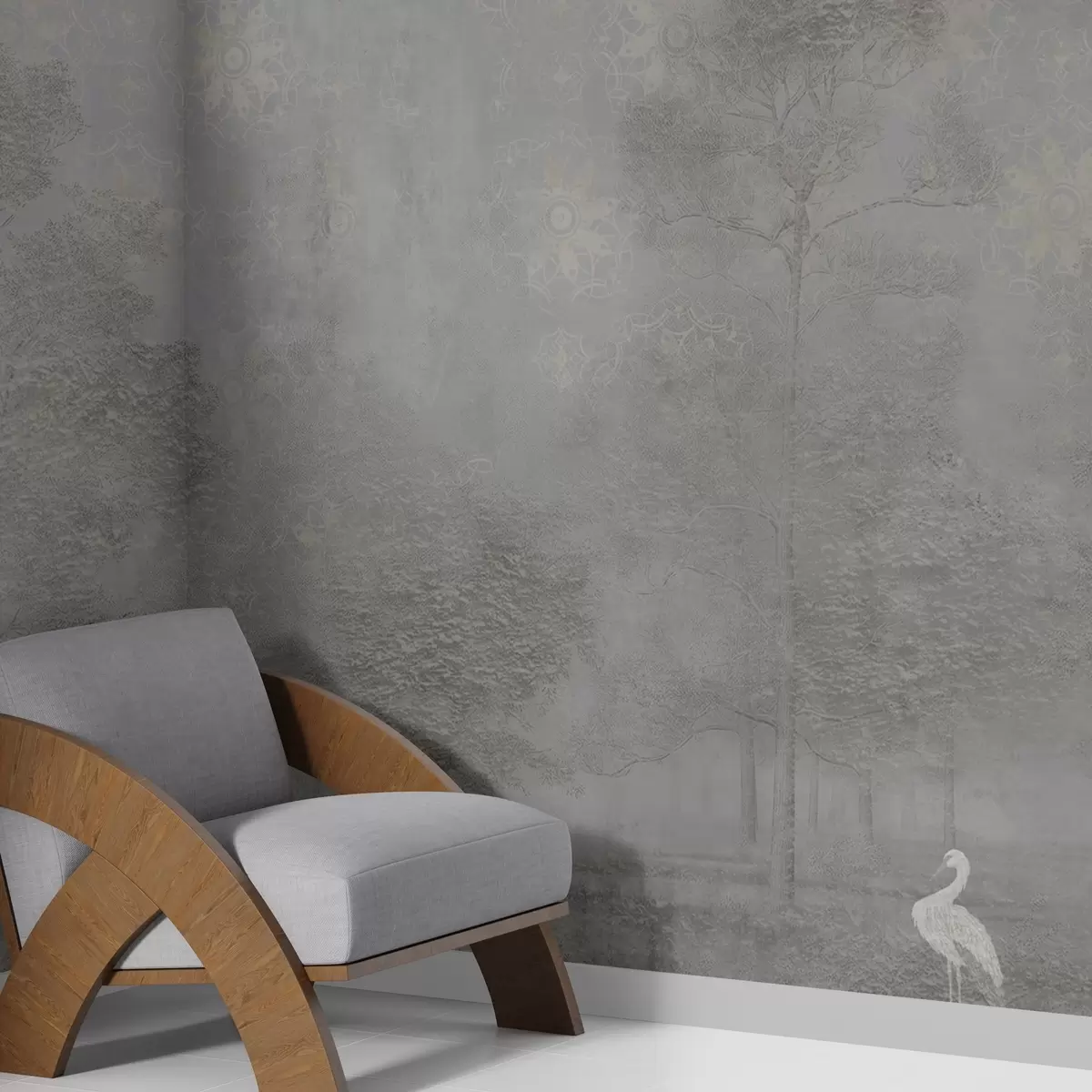 Тапете за зид Светло магловита шума са чапљом у хладним сивим тоновима бр. w04953v2