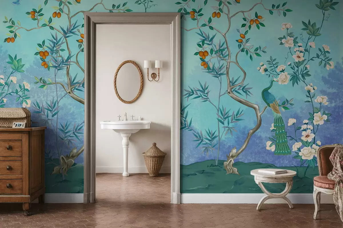 Тапете за зид Сцена са дрвећем, цвећем и птицама, плава позадина бр. w05004v2