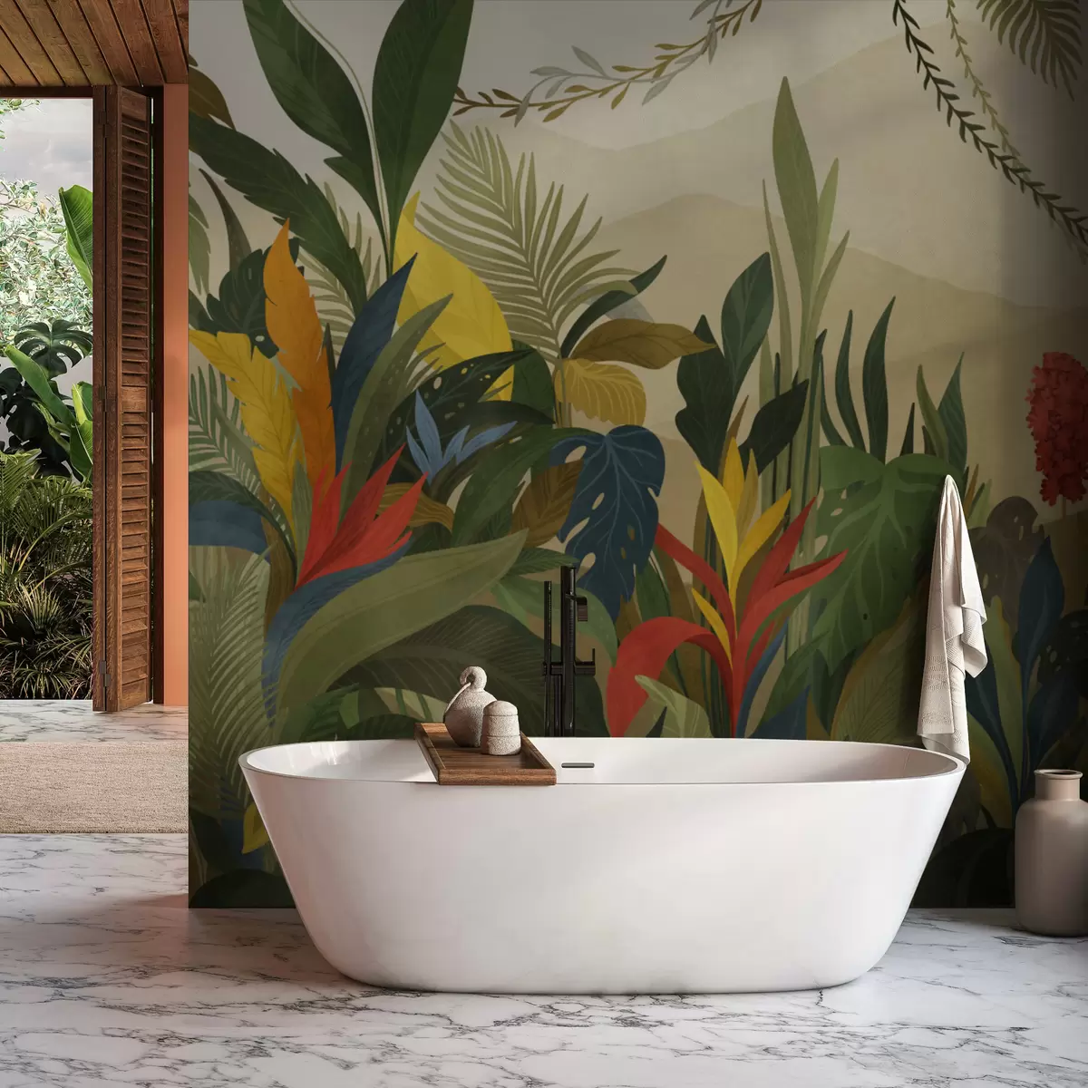 Тапете за зид Тропско лишће са великим листовима и цветовима бр. w05019