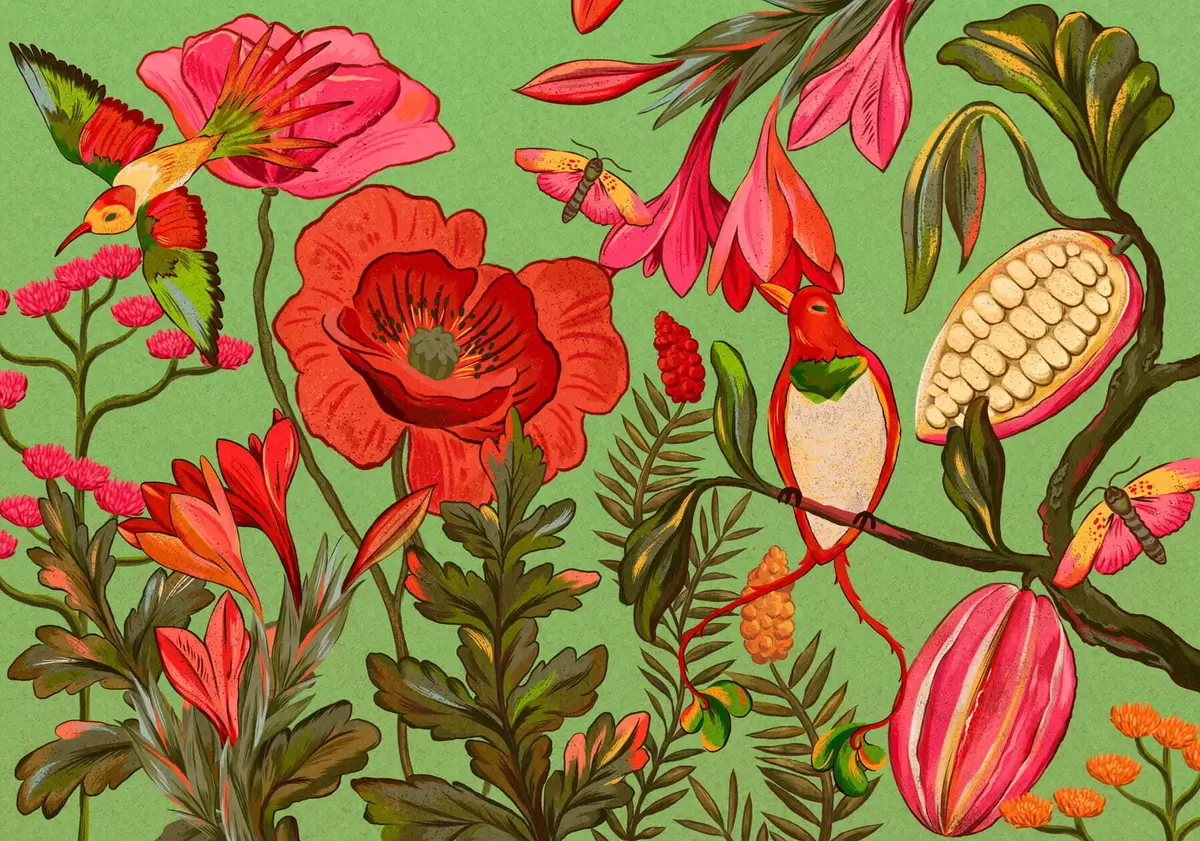 Тапете за зид Декоративно цвеће и птице на зеленој позадини бр. w05036v1
