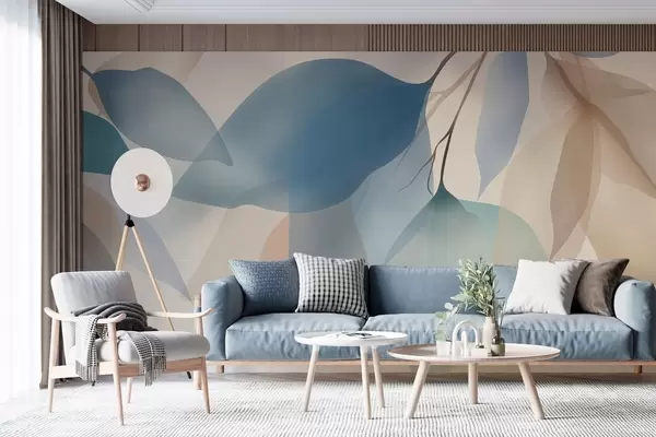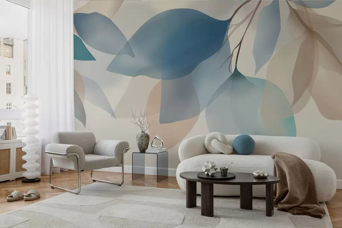 Тапете за зид елегантни полупровидни листови у нијансама плаве и беж бр. w05060