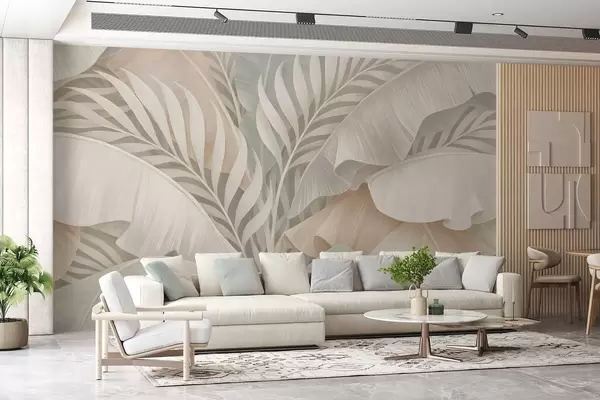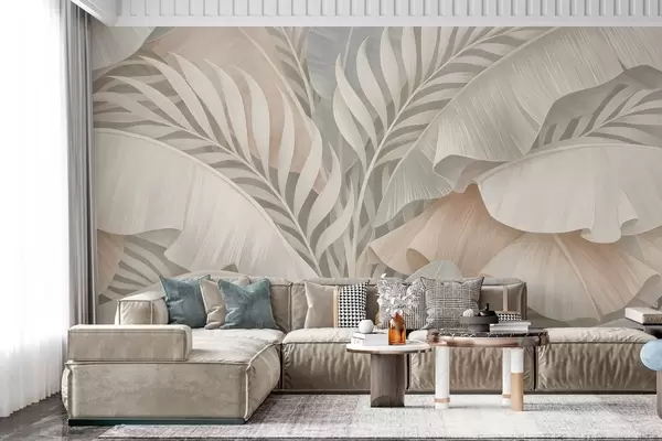 Тапете за зид велики тропски листови у нијансама брескве и тамно тиркизне боје бр. w05062