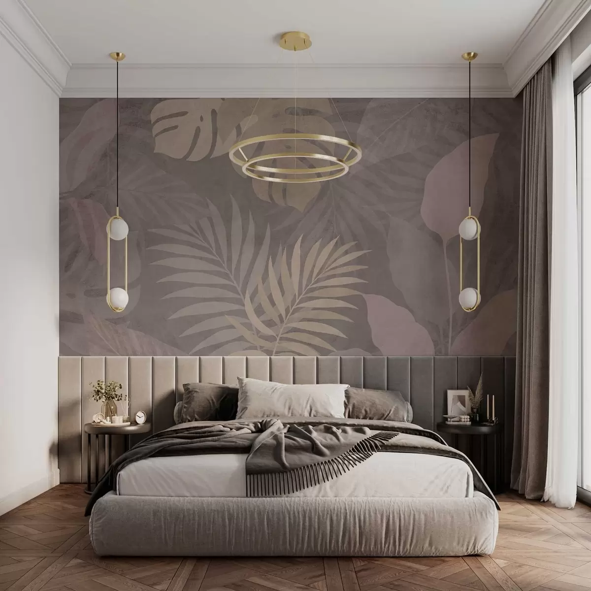 Тапете за зид текстурирано тропско лишће на сивој позадини бр. w05063v1