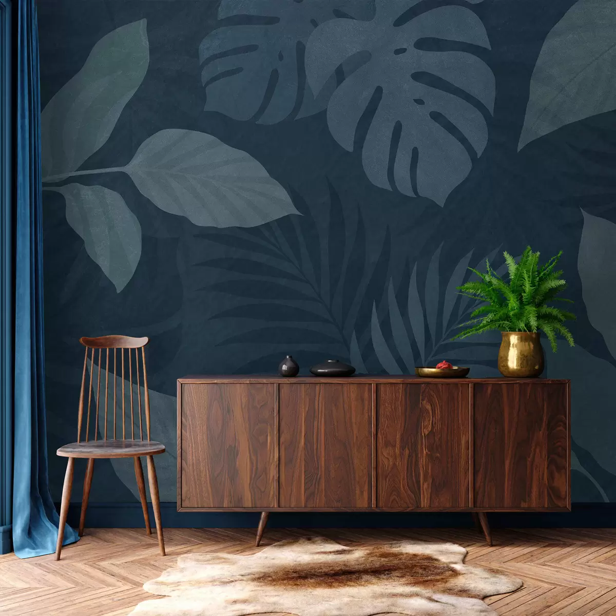 Тапете за зид текстурирано тропско лишће на тамноплавој позадини бр. w05063v3