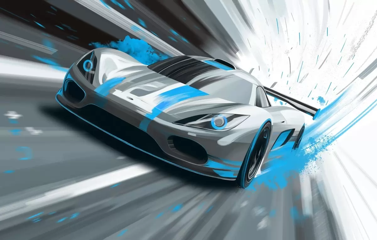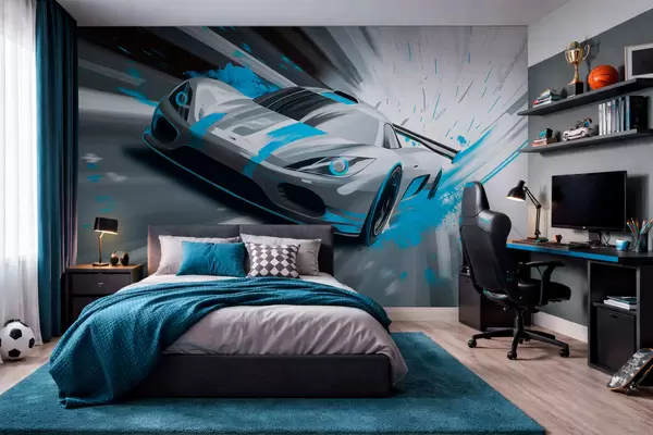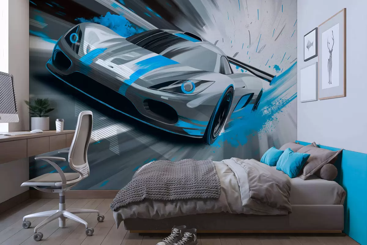 Тапете за зид динамичан спортски аутомобил у стилу дигиталног цртања са тиркизним акцентима бр. w05069v3