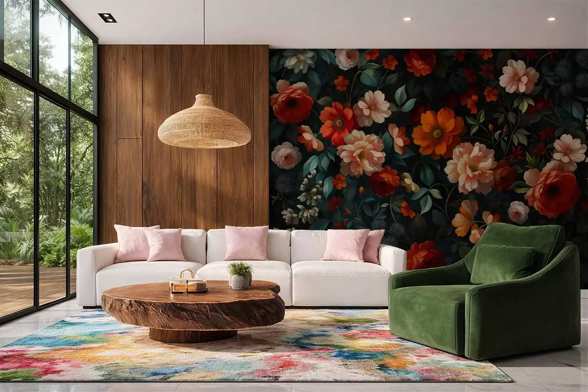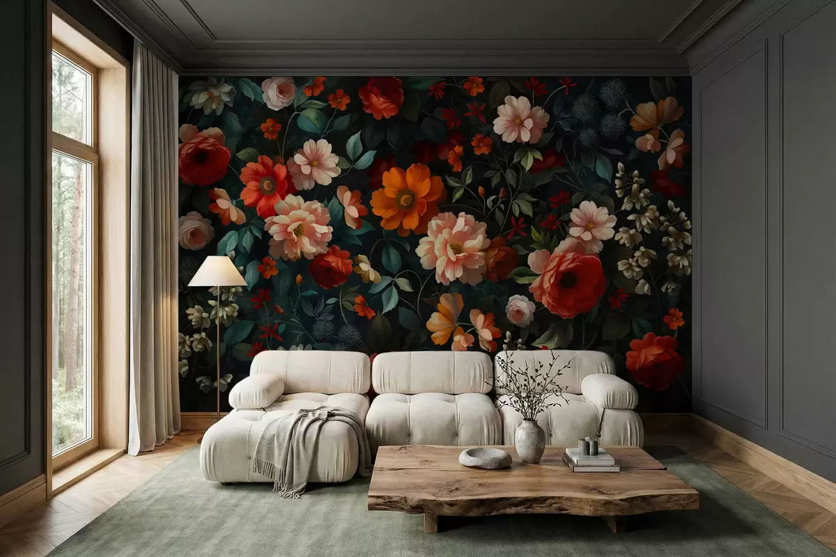 Тапете за зид Тамни цветни узорак са бујним баштенским цвећем бр. w05087